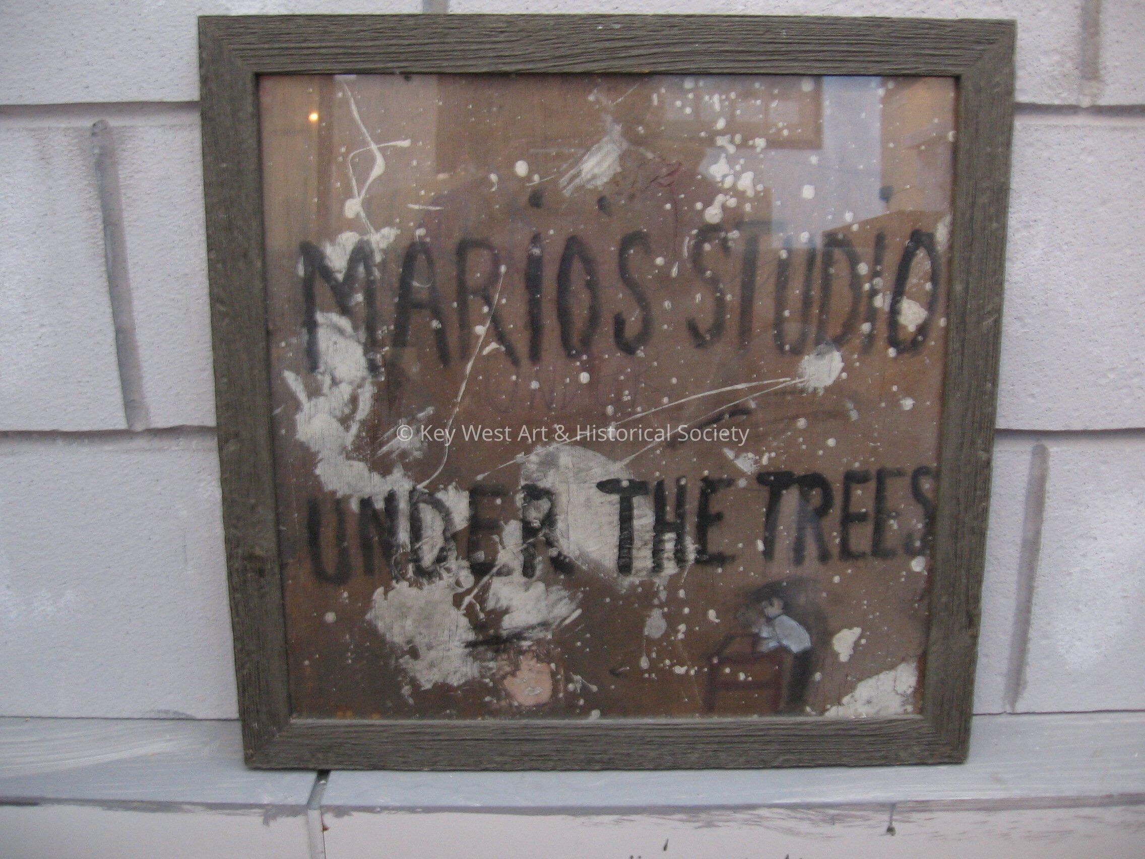 Studio sign that reads "Mario's Studio Under the Trees". Sign has white paint and some pen and pencil marks on it. Framed.Collection