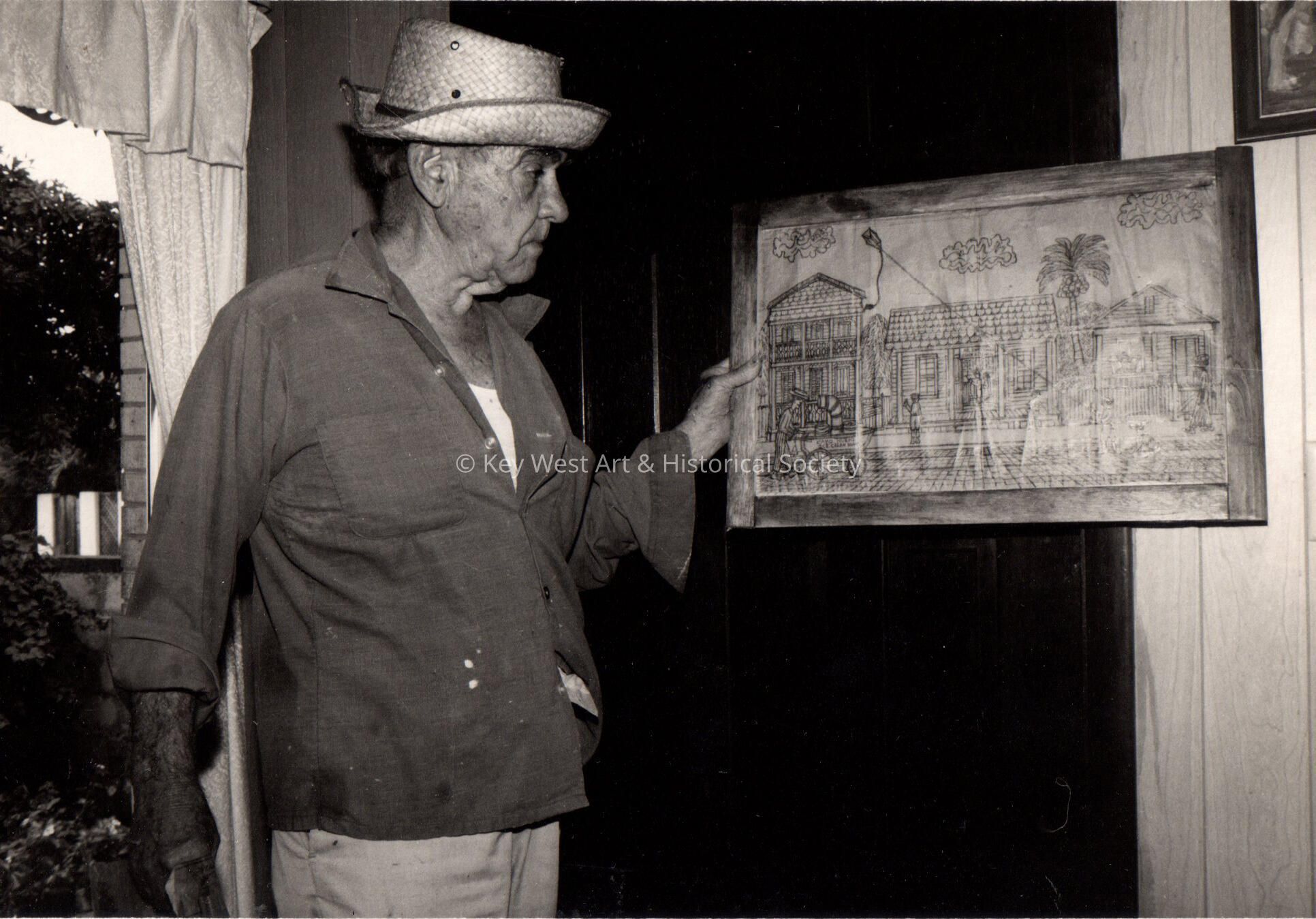 Mario Sanchez at brother Perucho's home in Key West with typical hat and one of his drawings.