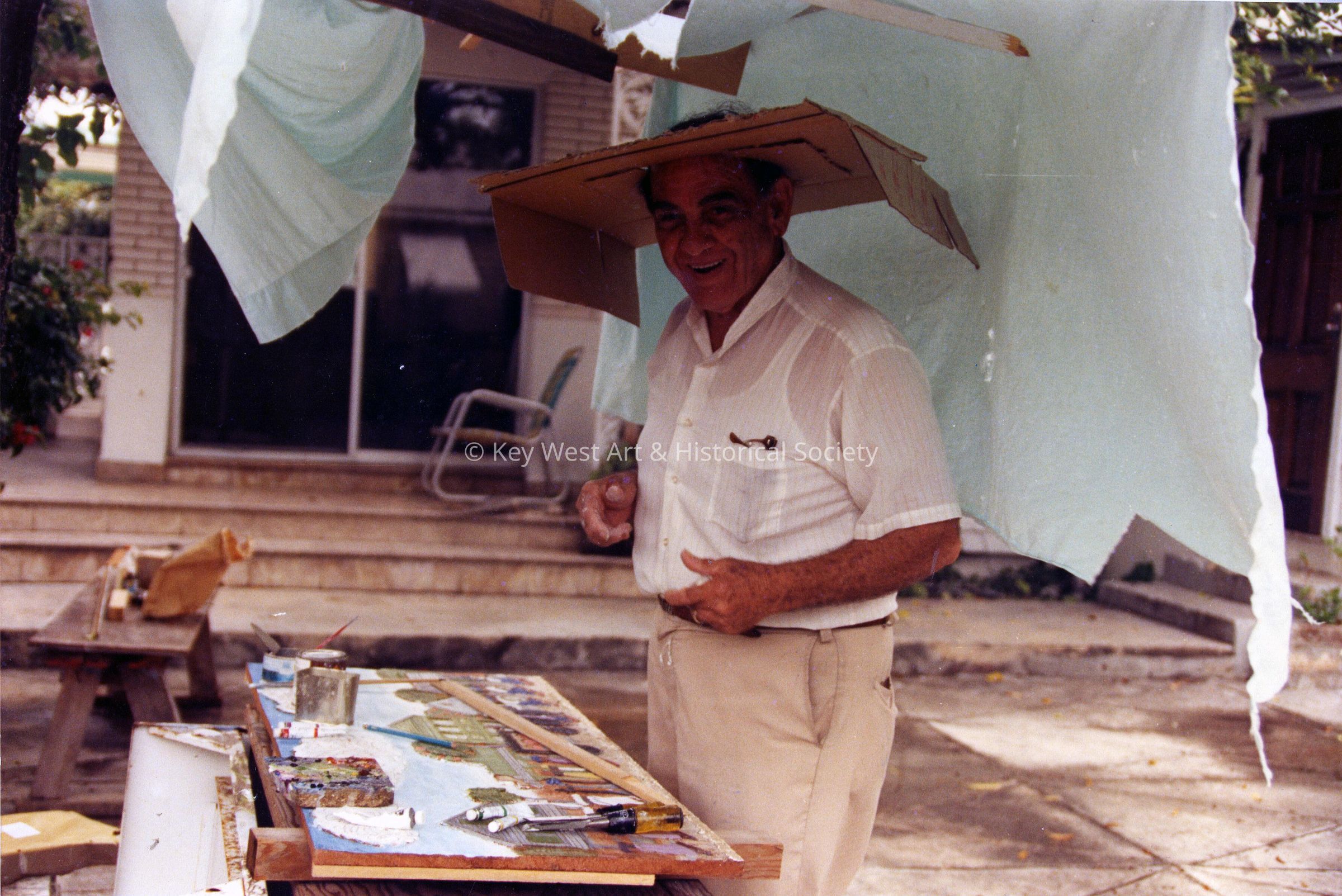 Color photograph of Mario Sanchez in his Studio Under the Trees with a wood carving.
