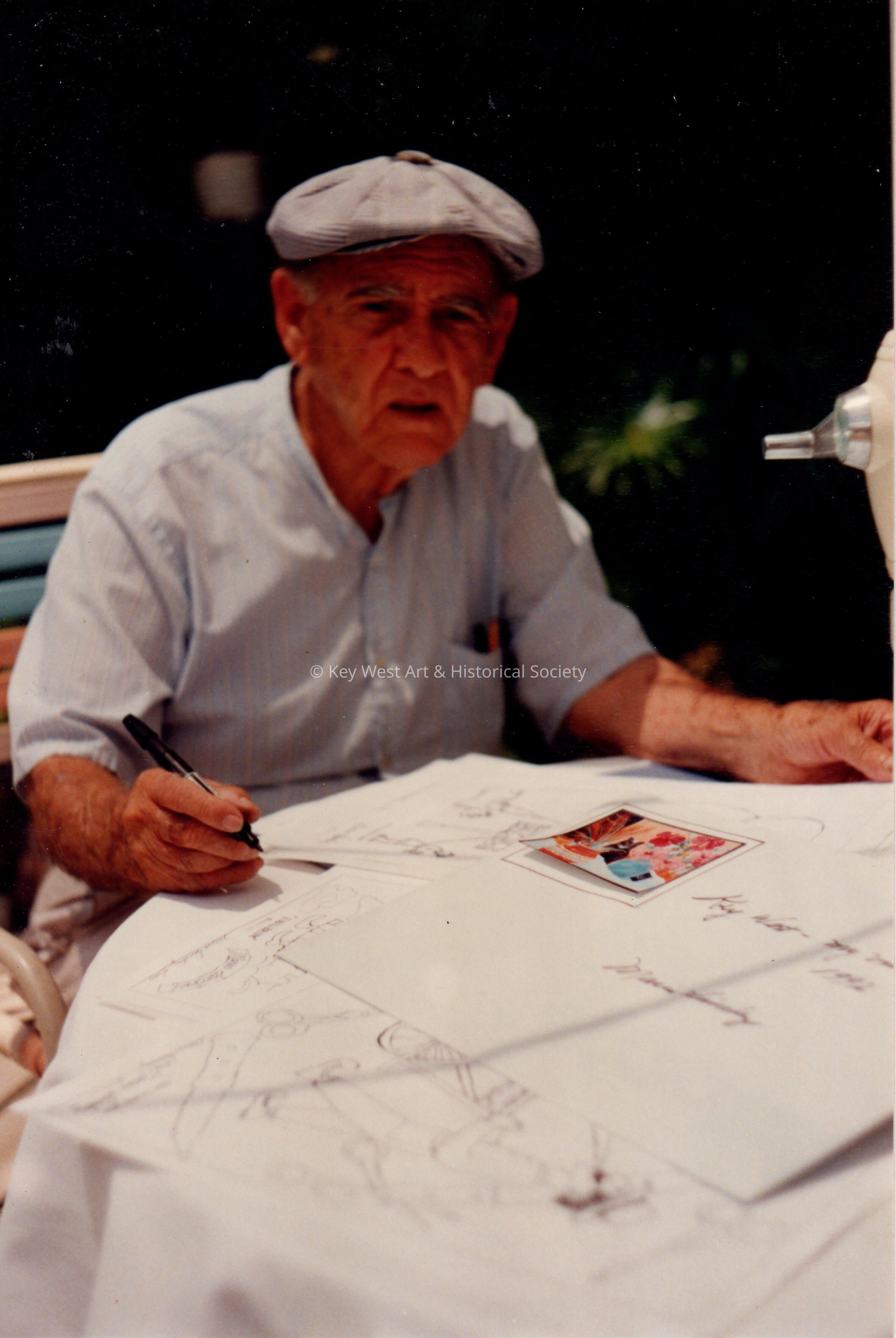 Mario Sanchez signing prints of his artwork.