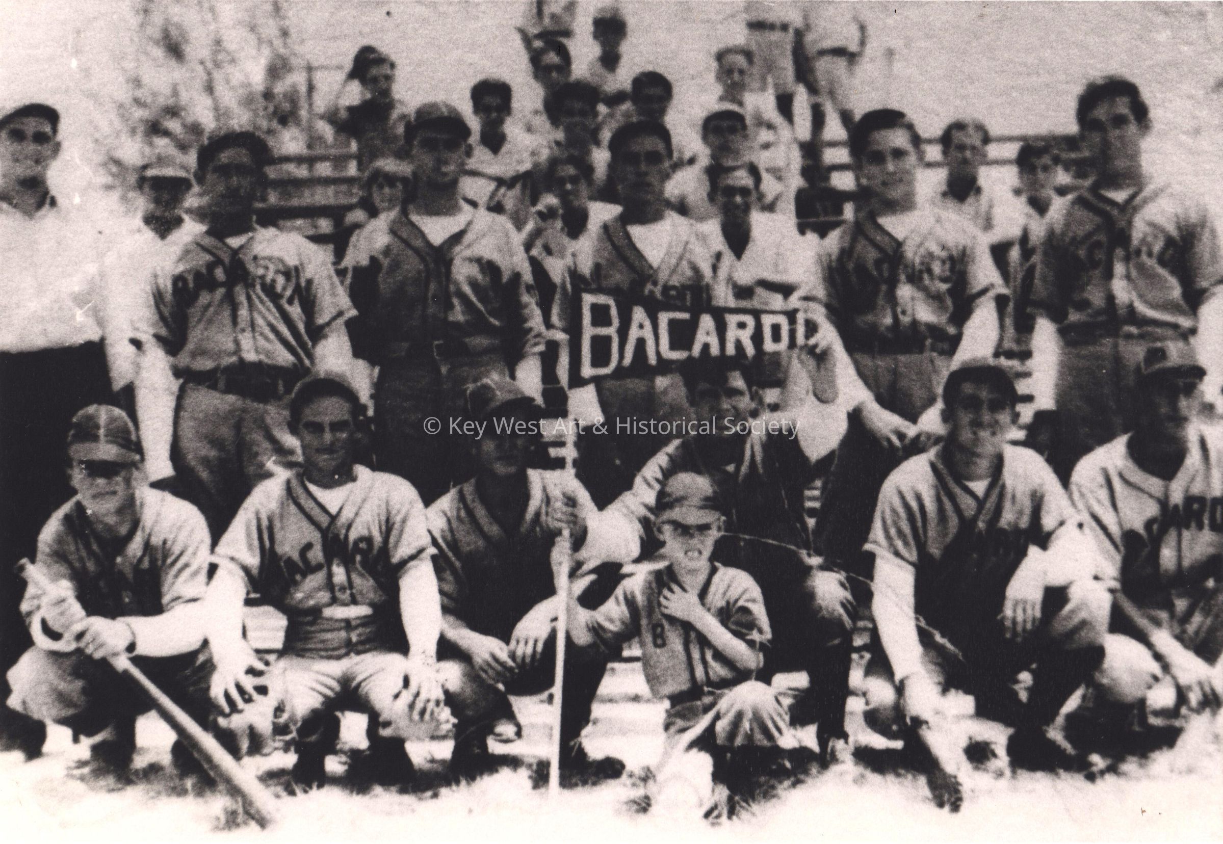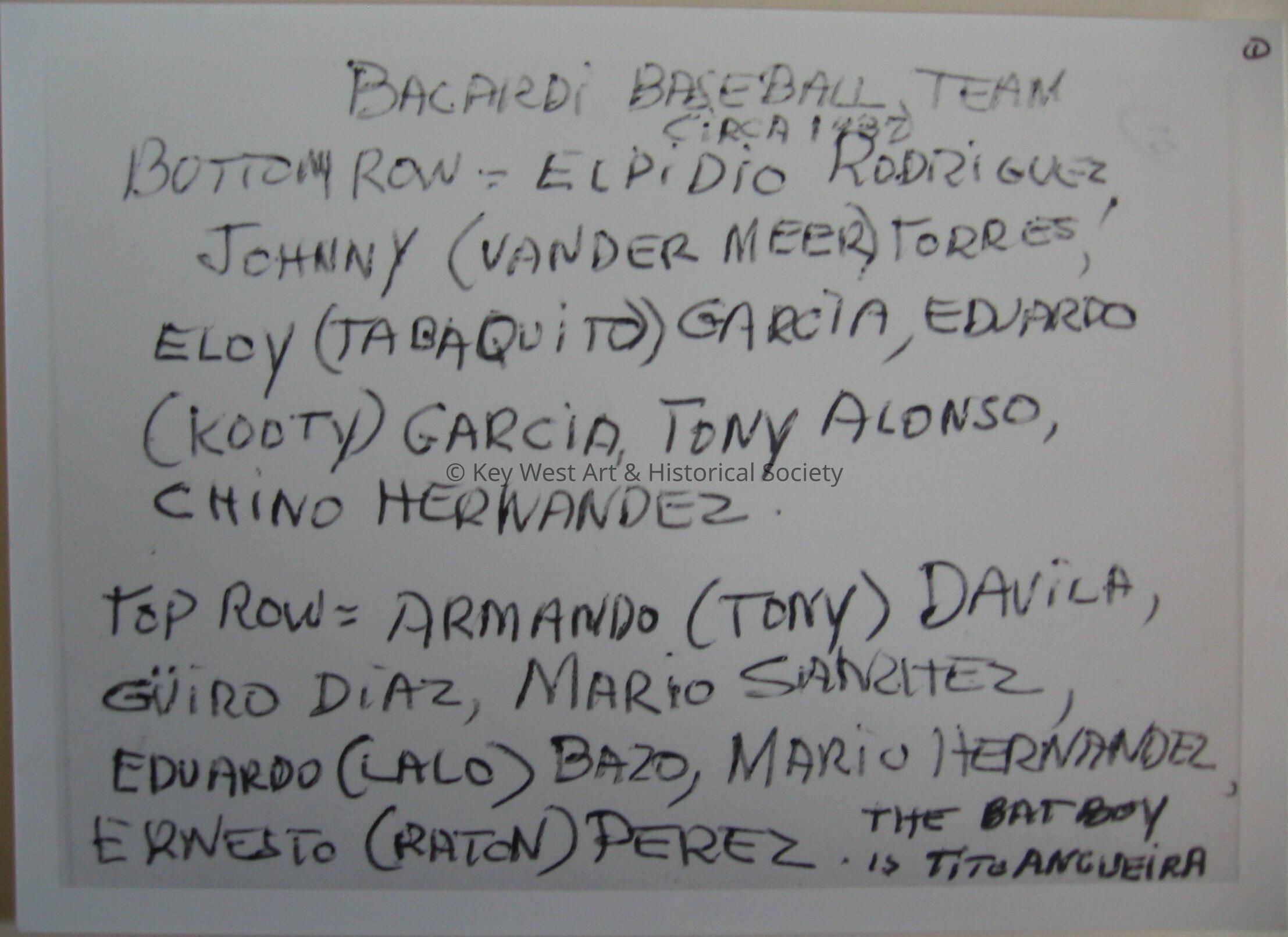 Bacardi Baseball Team, in 1937. Bottom Row Elpidio Rodriguez, Johnny (Vandermeer) Torres, Eloy (Tabaquito) Garcia, Eduardo (Kooty) Garcia, Tony Alonso, and Chino Hernandez. Top Row Armando (Tony) Davila, Guiro Diaz, Mario Sanchez, Eduardo (Lalo) Bazo, Mario Hernandez, Ernesto (Raton) Perez. The bat boy is Tito Angueira.Photograph Details