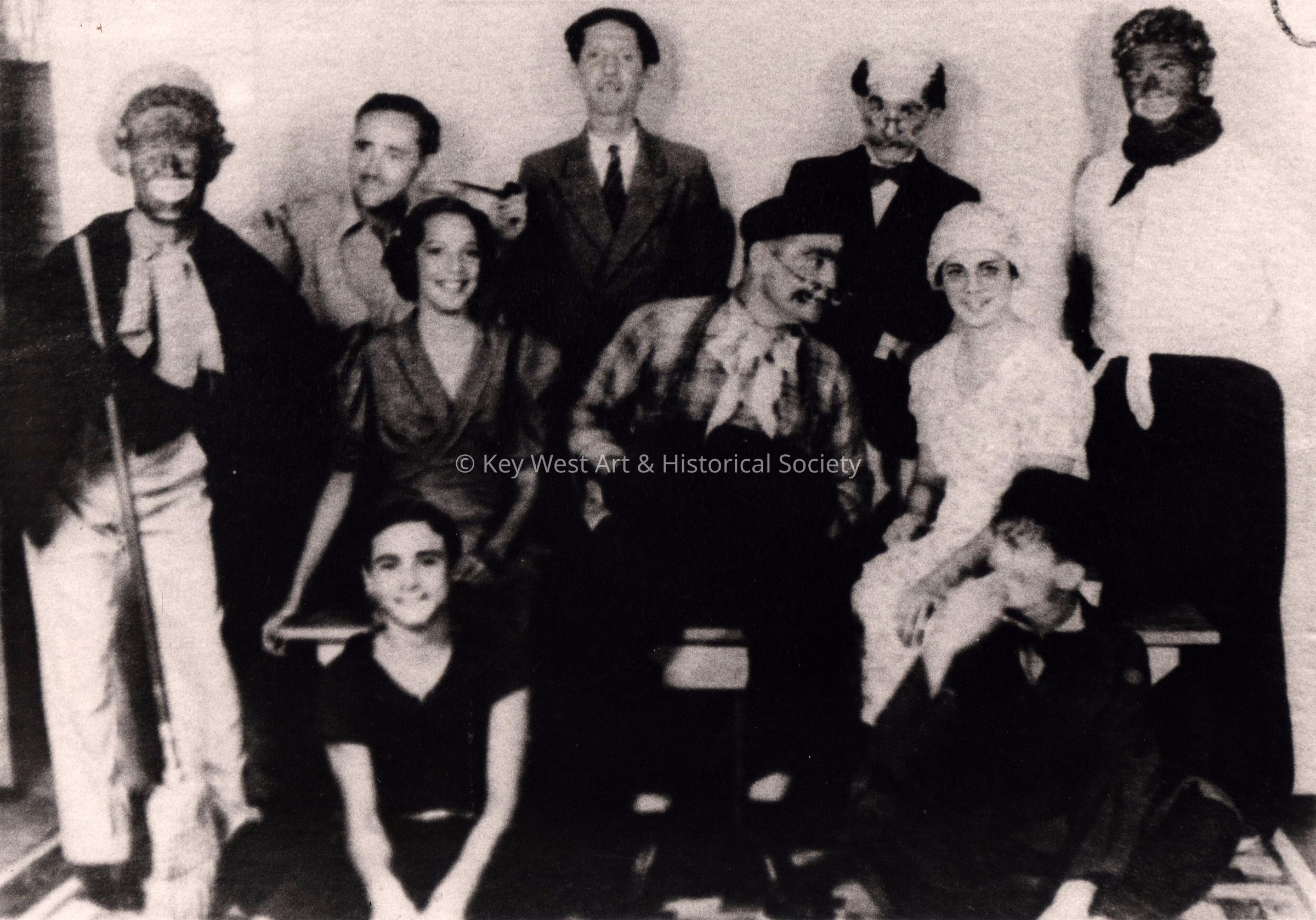 Cuban Vaudeville Thespians. Sitting are Paul and Milton Esquinaldo. Center Row Chino Cordero, Gelib Bello, Bienvenido Perez, and Lola Bello. Top Row Ernest (Baby) Salazar, Washington Malgarat, Enrique Esquinaldo, Jr, and Mario Sanchez.Photograph Details
