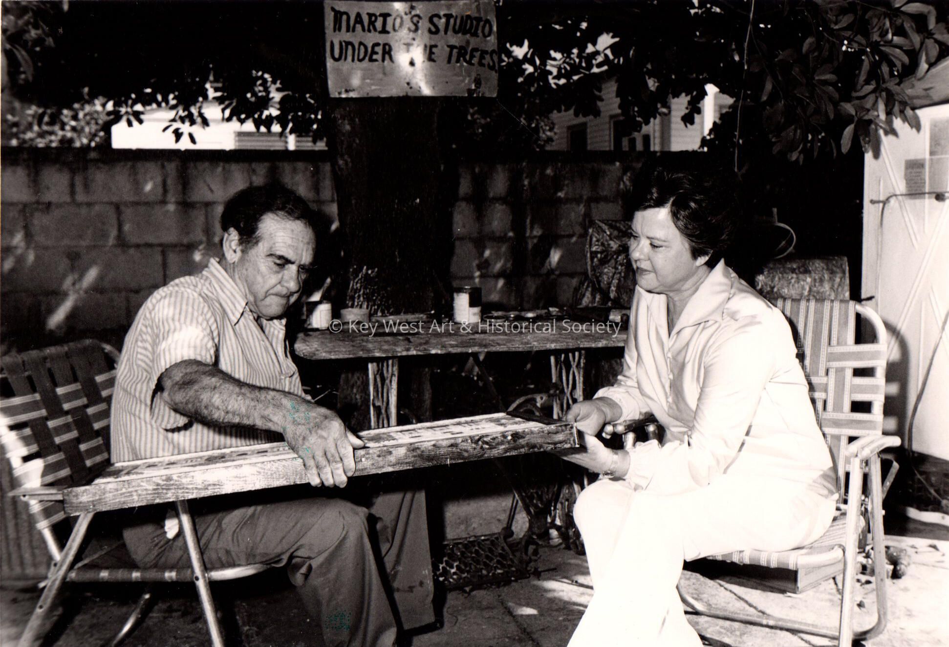 Black and white photograph of Mario Sanchez and Kathryn Proby in his Studio under the Trees.Photograph Details