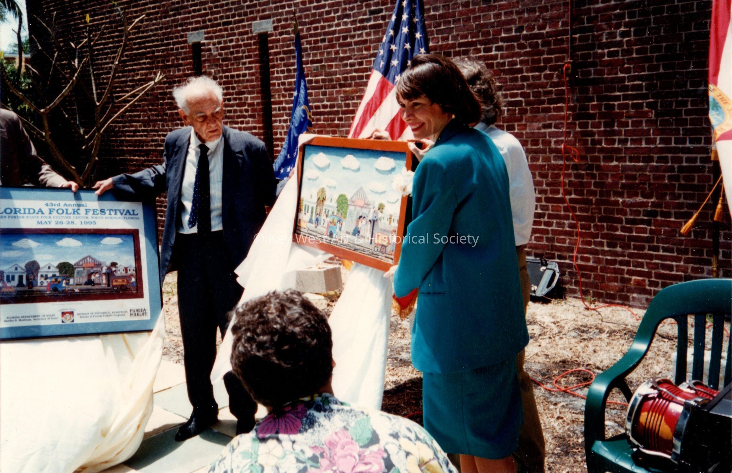 Mario Sanchez Day (April 21, 1995) at East Martello - Mario Sanchez holds a sesquicentennial poster depicting the carving held by Secretary of State Sandra Worthen.Collection