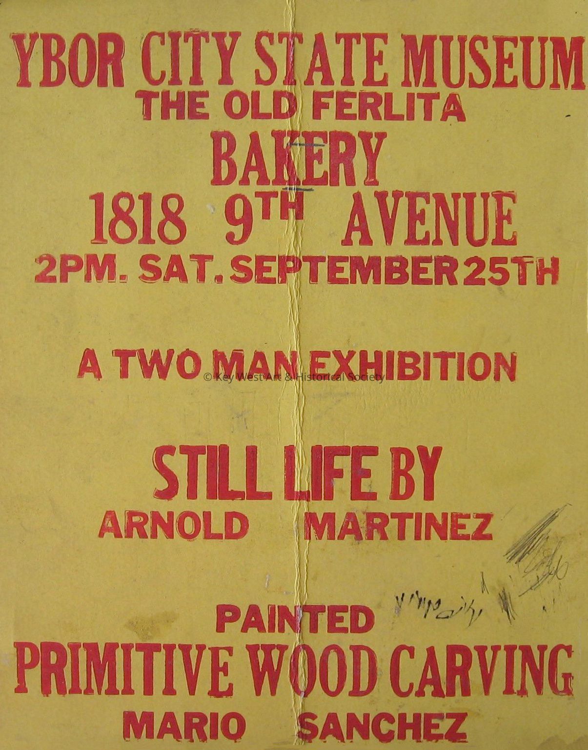 Advertisement for a two man exhibition at the Ybor City State Museum. The exhibit features 'Still Life' by Arnold Martinez and Painted Primitive Wood Carvings by Mario Sanchez. Show will be held on September 25, 1982, at 2 p.m.Collection