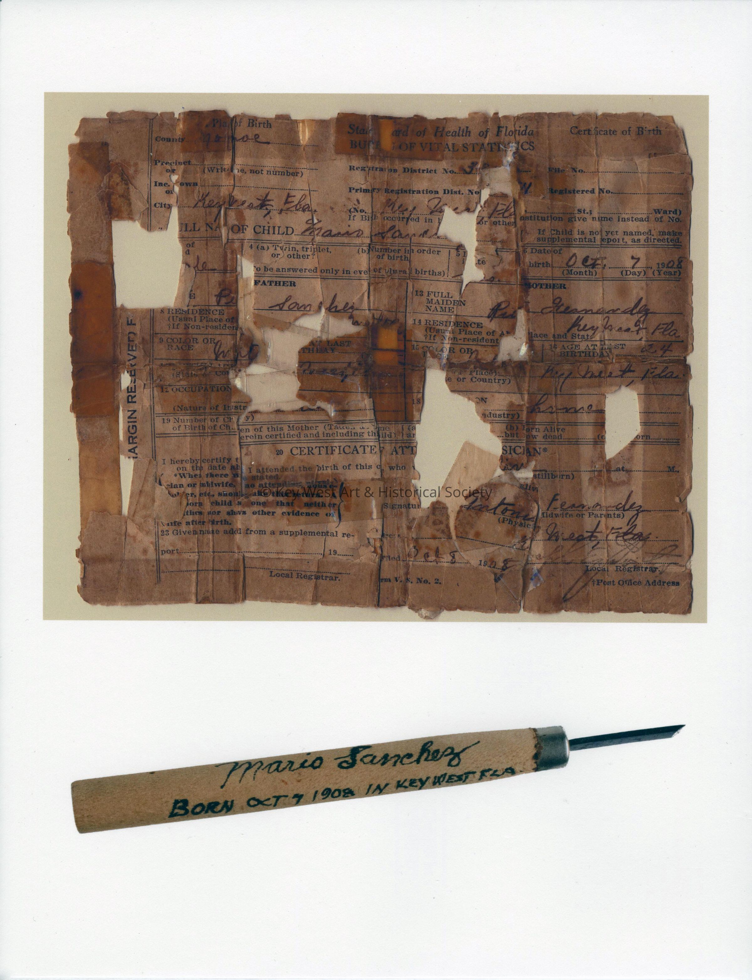 A professionally-produced print depicting Mario Sanchez's birth certificate and wood carving tool. The print is shrink wrapped with a piece of white foamcore.Collection