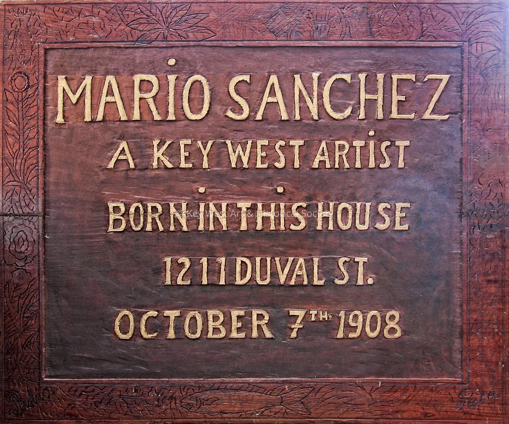 Wood carving sign by Mario Sanchez denoting his birthplace. Carving reads, 'Mario Sanchez, A Key West Artist Born in this House, 1211 Duval St., October 7th 1908'. Edges of plaque have decorative carvings.Type of Sculpture