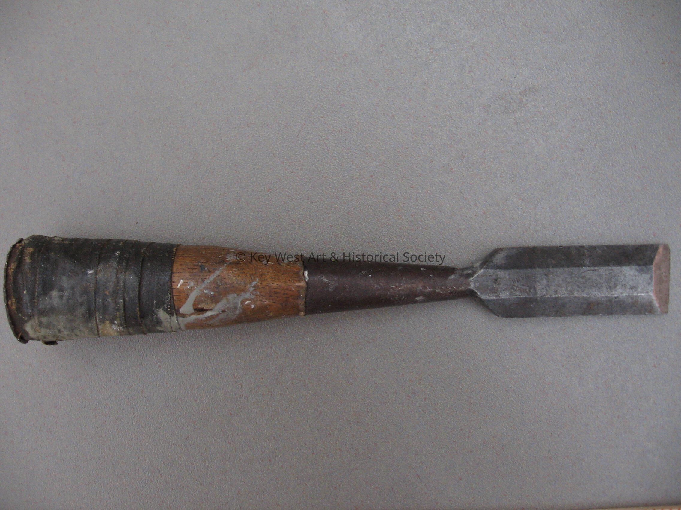 Wood and metal chisel used by Mario Sanchez. Wooden handel has black tape around it ; bottom is made of metal.