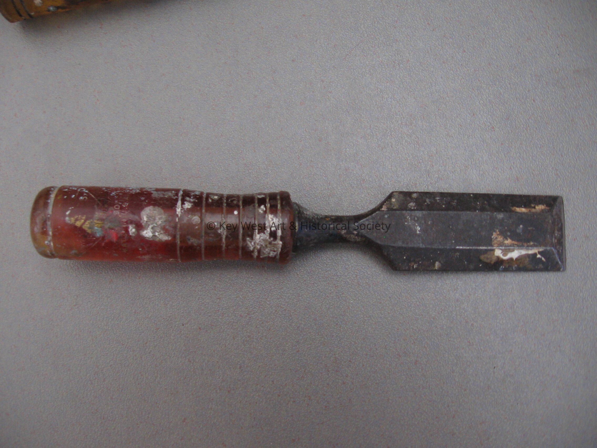 Chisel with red plastic handle and metal tip used by Mario Sanchez.Collection