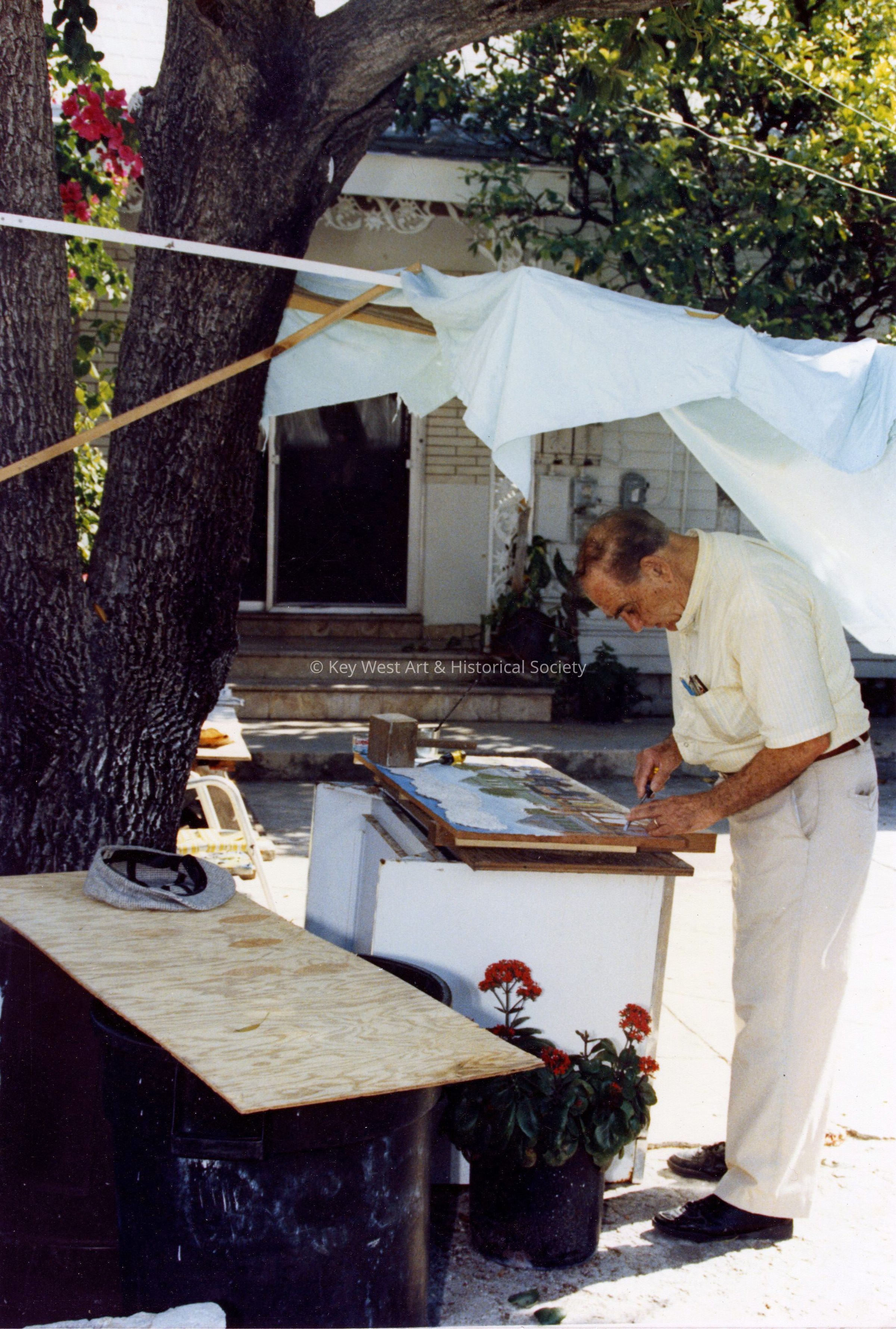 Color photograph of Mario Sanchez working in his Studio Under The Trees.
