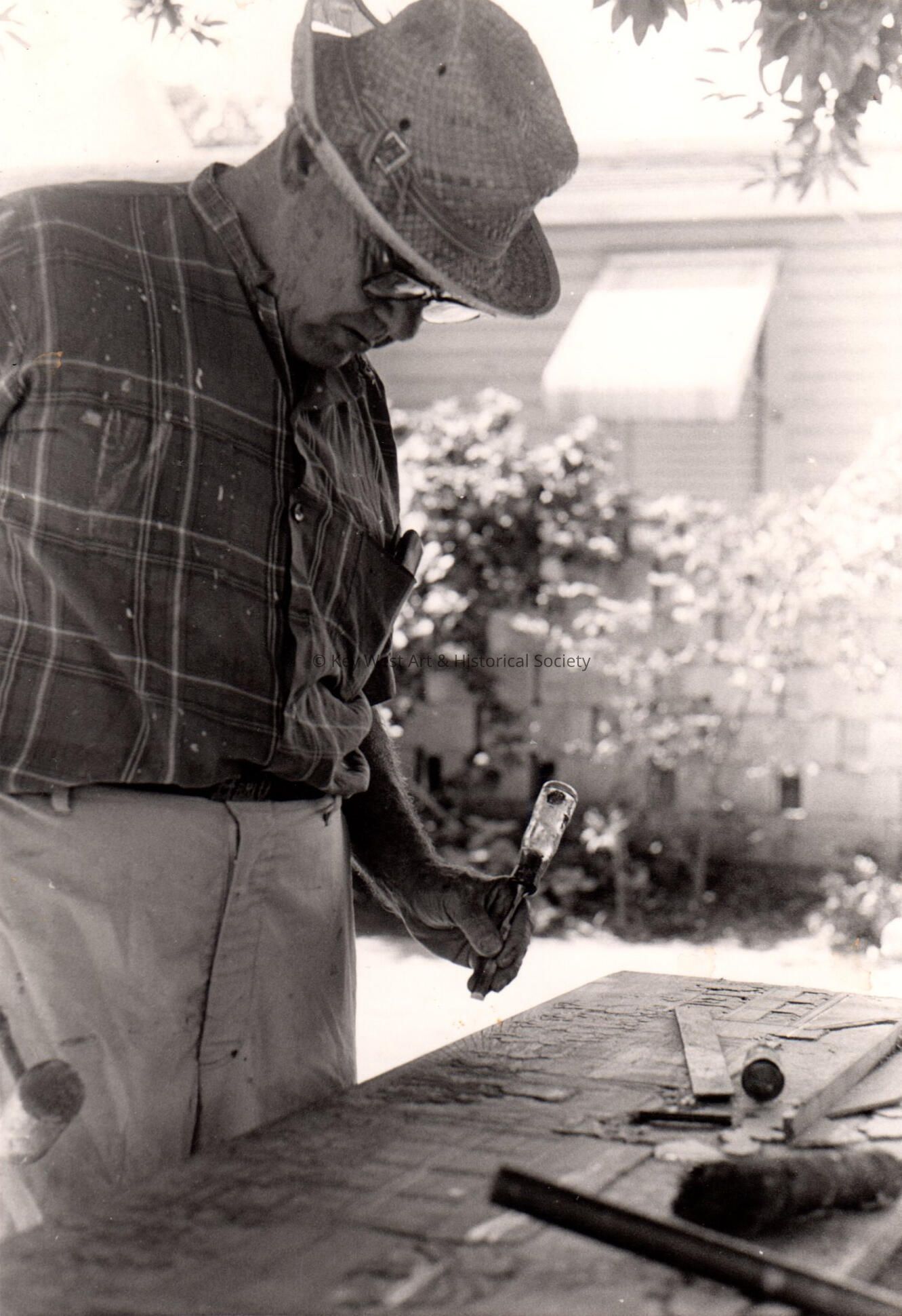 Black and white photograph of Mario Sanchez in his Studio under the Trees.Photograph Details