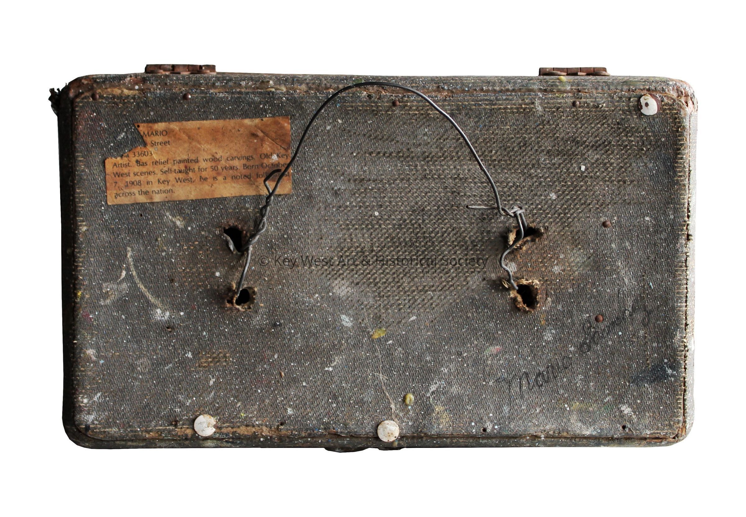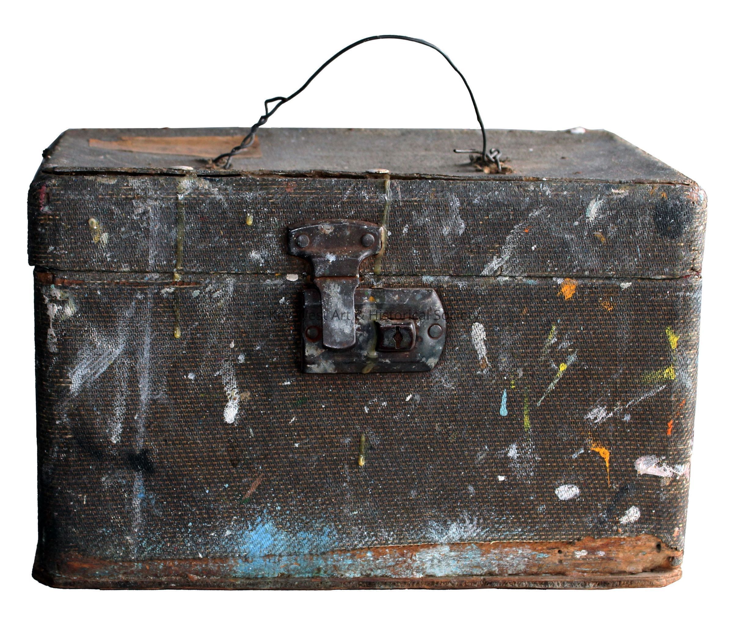 Wood box with hinged lid covered with dark greenish brown woven fabric that was used by Mario Sanchez as a tool and paint box. Handle is not original. Signed by Sanchez on the lid while a card was glued to the lid with a brief biography of the artist.