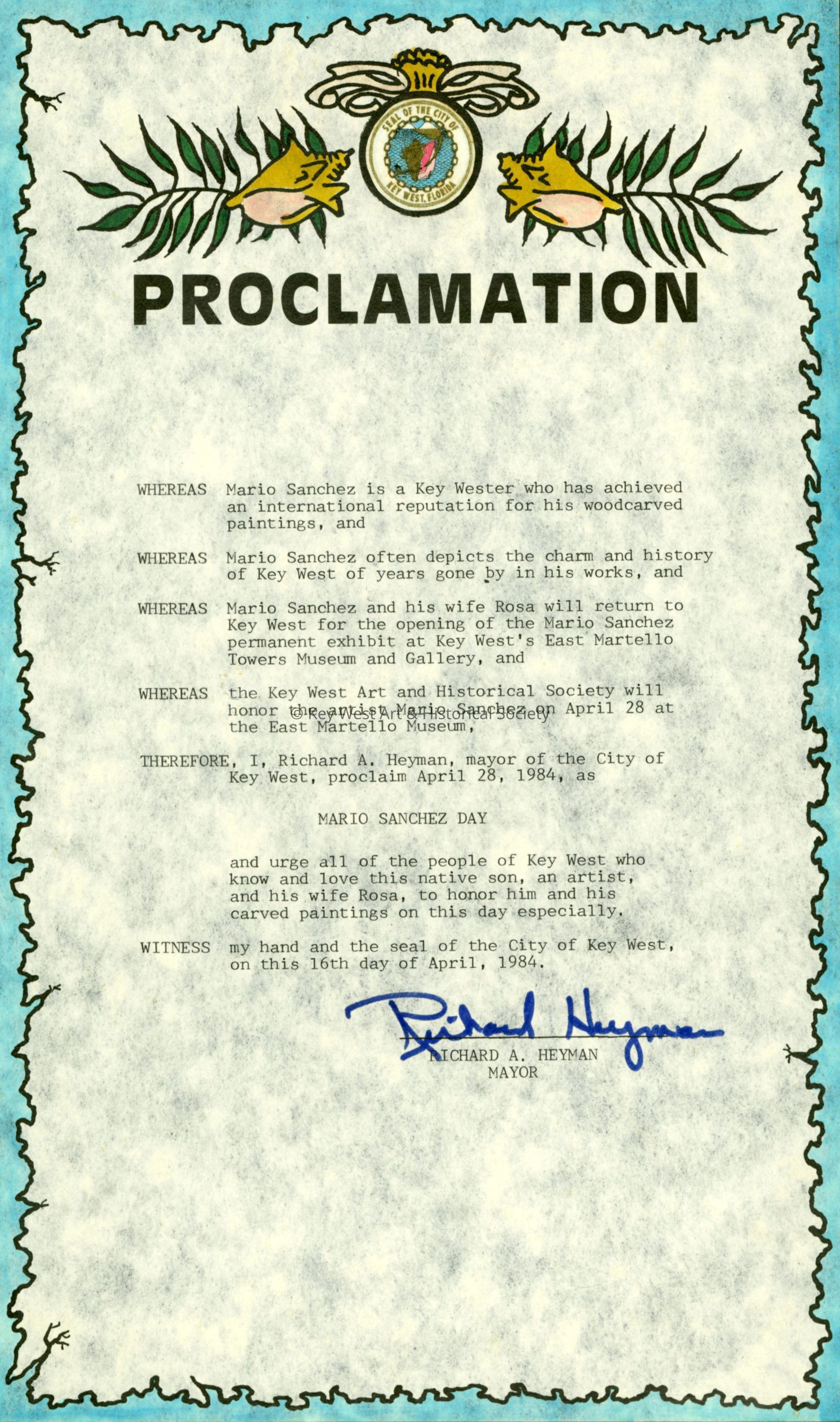 Proclamation bestowed on Mario Sanchez from the City of Key West honoring Sanchez for his contributions to the island's arts community. Key West mayor Richard Heyman proclaimed April 28, 1984 as Mario Sanchez Day.Collection