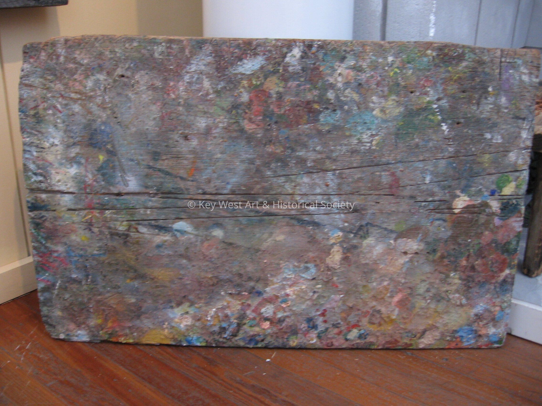 Piece of wood that was used by Mario Sanchez as a work table. Table is significantly gouged and covered in different color paint splatters.