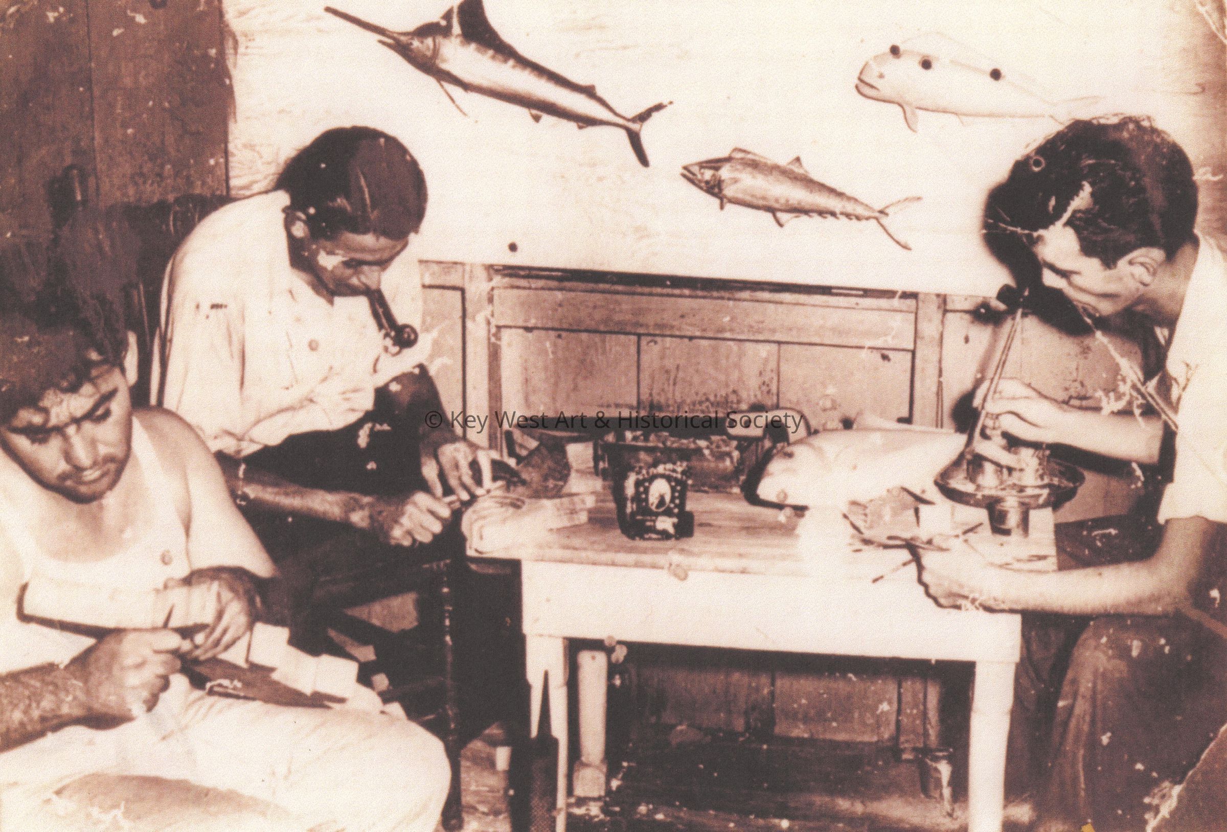 Men carving fish from wood. Black and white photo copy of Mario Sanchez, Tony Barcelo, and Nilo Sanchez all working together at a table.Photograph Details