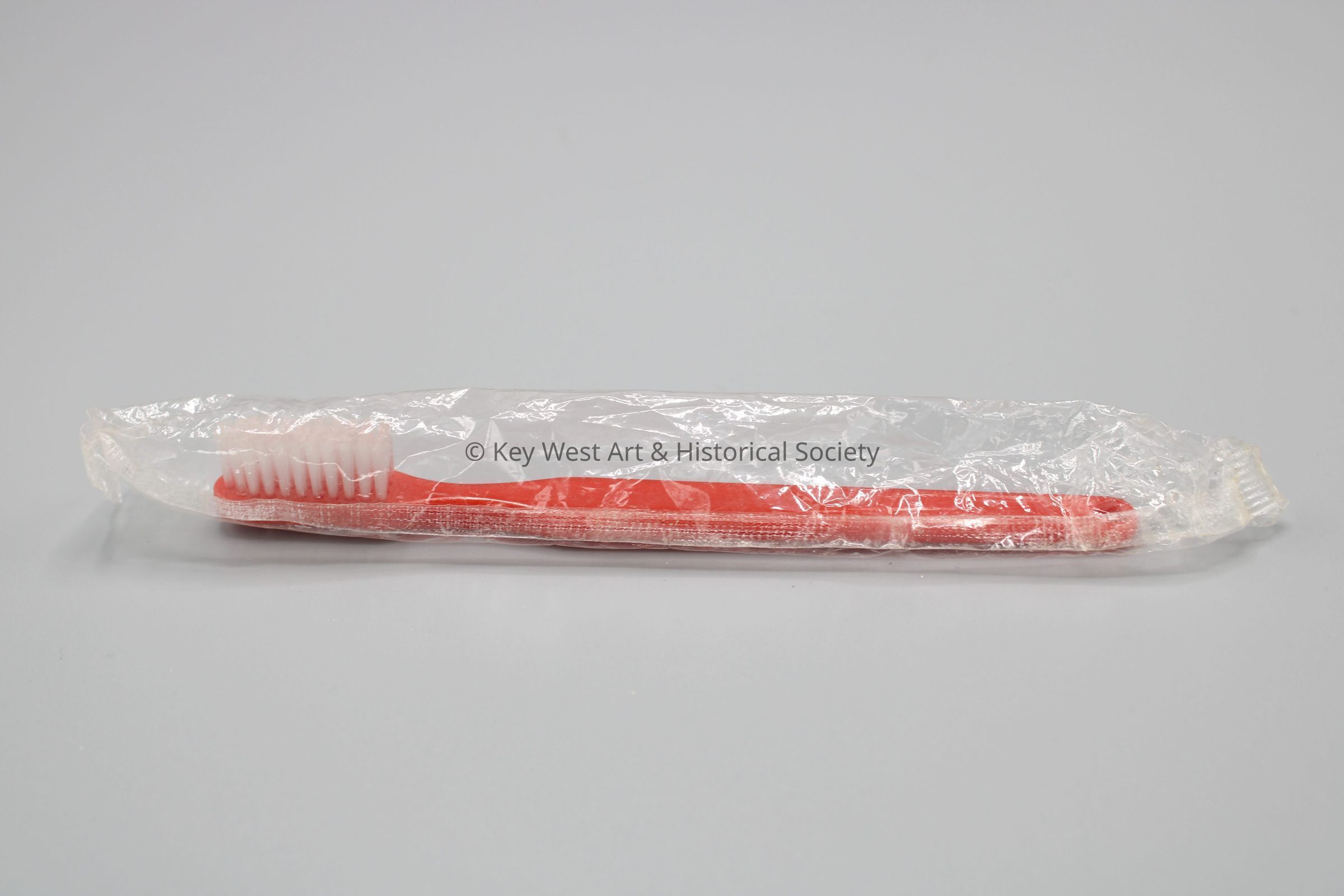 Red toothbrush in original plastic packaging owned by artist Mario Sanchez.