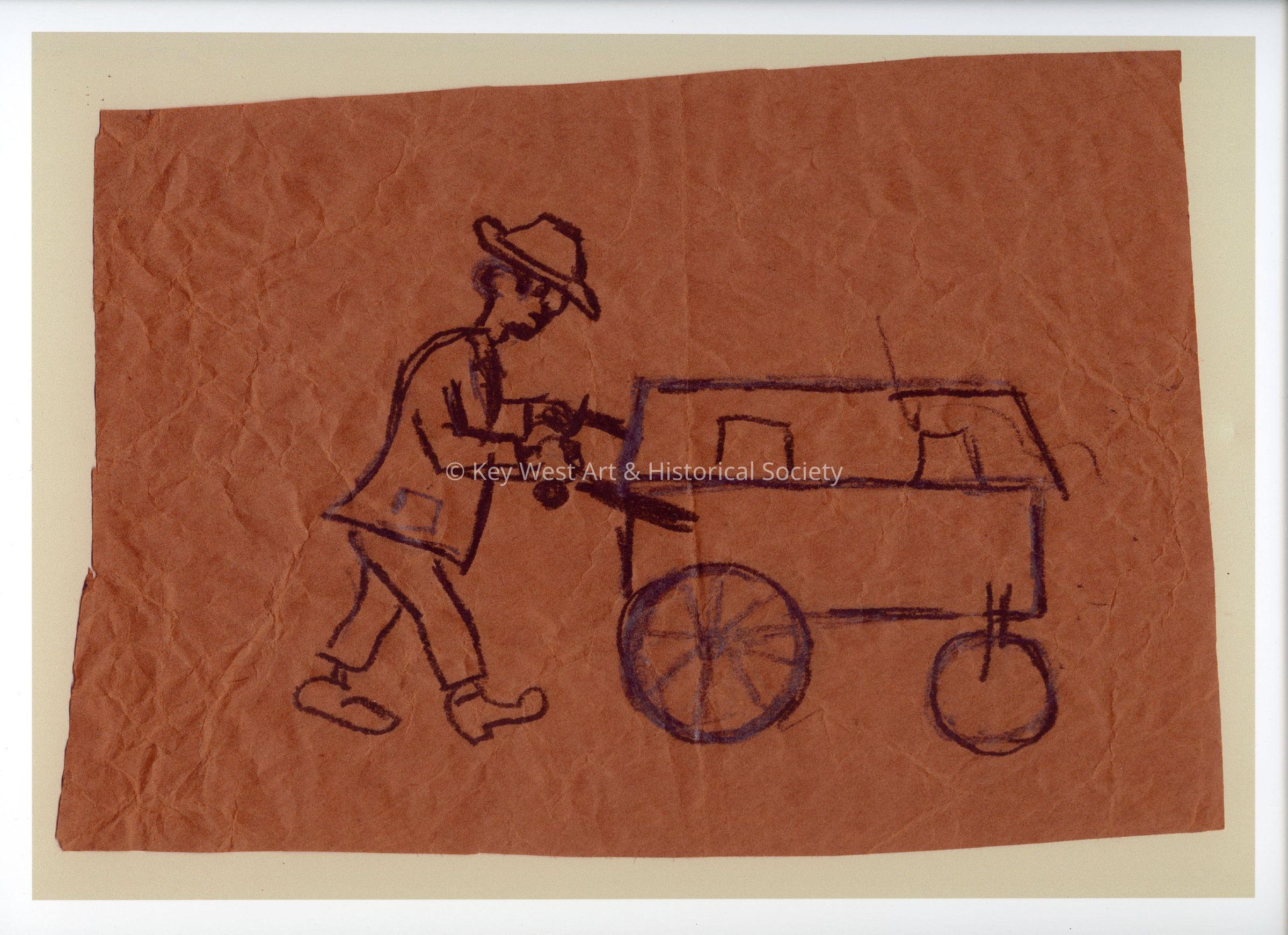 A high quality print of an unfinished Mario Sanchez sketch depicting a man pushing a cart. The print is shrink-wrapped with a piece of white foamcore behind it.