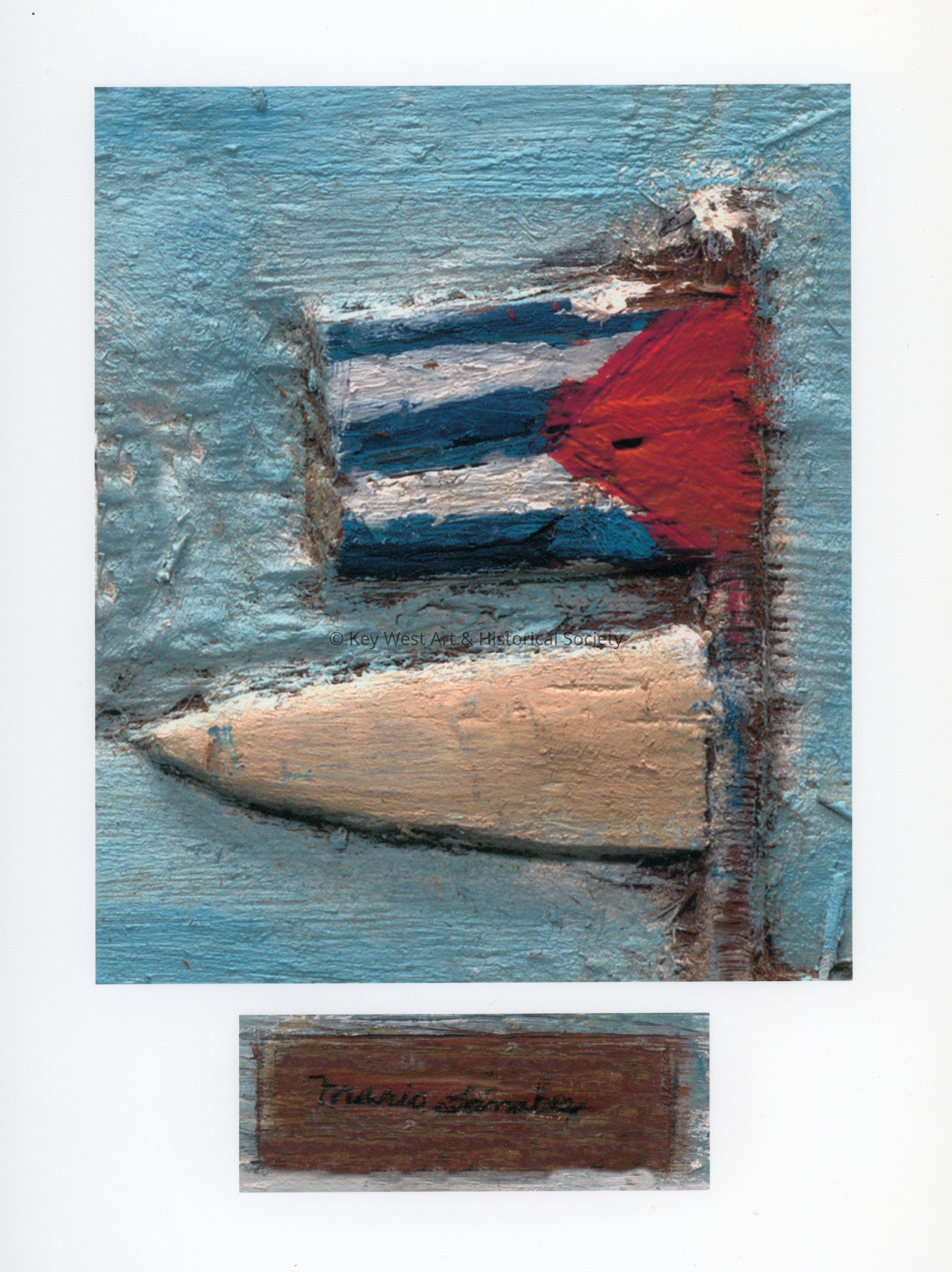 A high quality print of a close up of the Cuban flag as seen in one of Sanchez's unfinished intaglios. The print is shrink-wrapped with a piece of white foamcore behind it. Behind the foamcore is a brief description of the image reading 'The Cuban Flag / "La Bandera Cubana" Depicted in one of Mario's "Unfinished Works."'