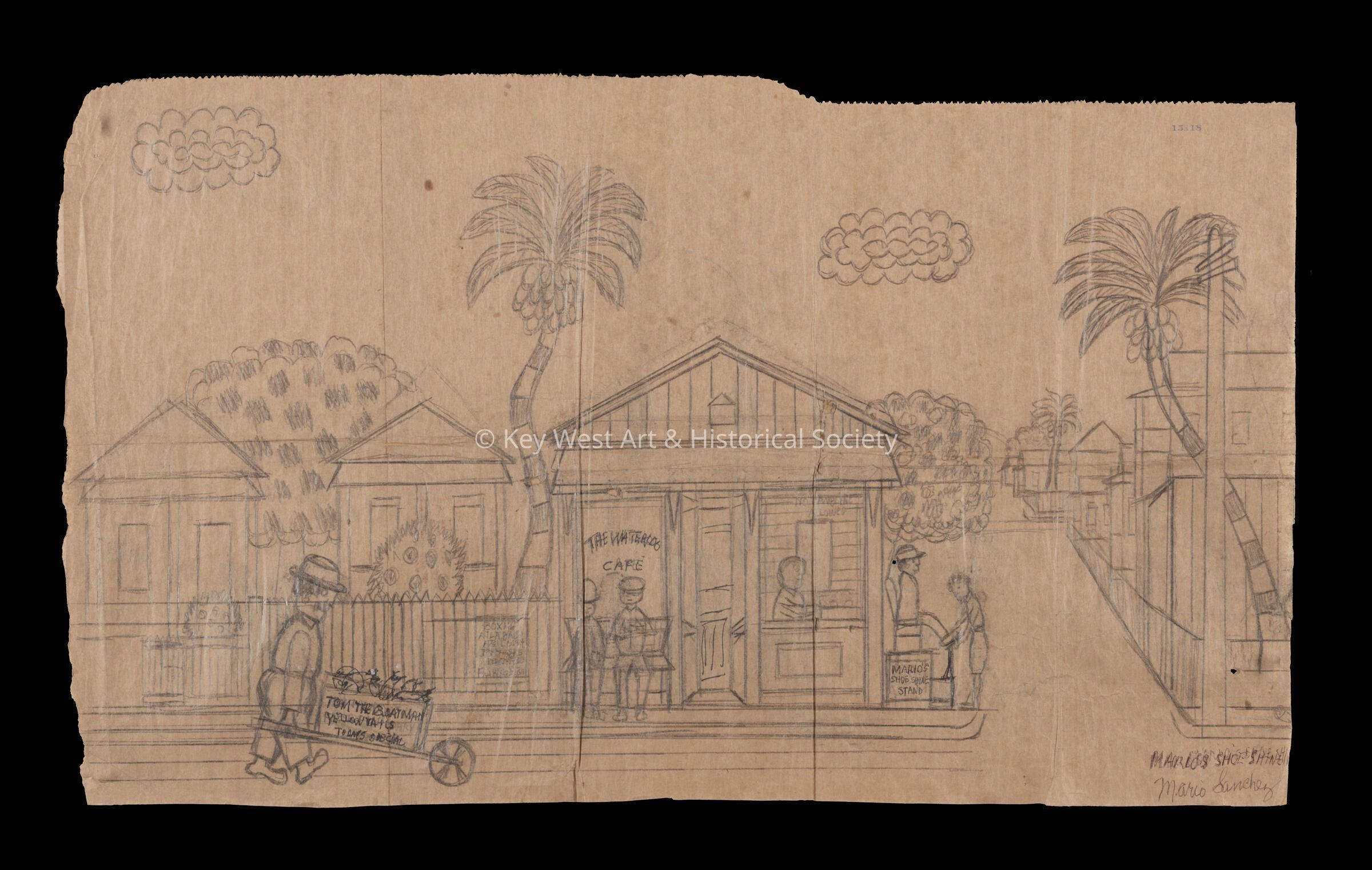 Pencil sketch on an unfolded paper bag by Mario Sanchez depicting the Waterloo Cafe and Mario's Shoe Shine Stand alongside the building.Type of Drawing