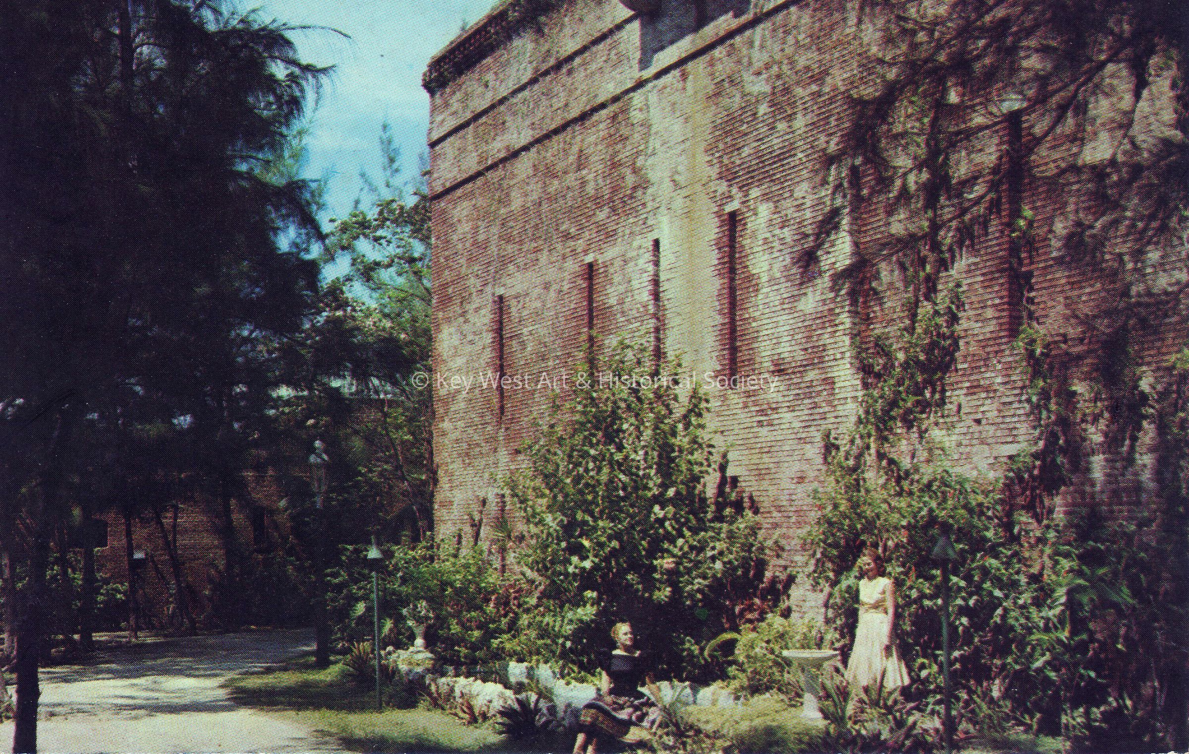 Postcard depicting two women near a brick fort. The description the verso reads, ‘View of Tropical Garden and Civil War Citadel, Martello Gallery and Museum, Key West, Florida.’Collection