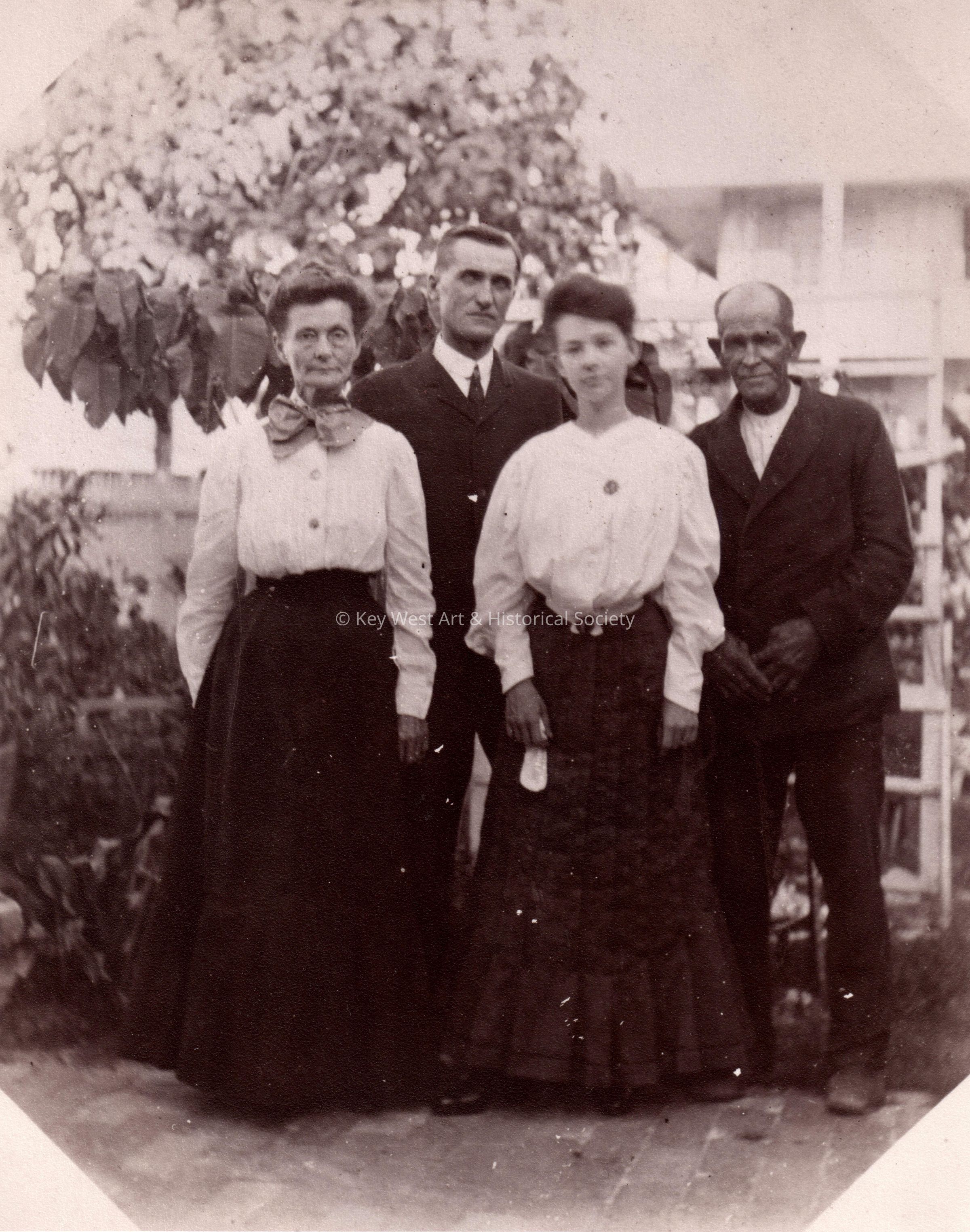 Black and white photograph of Mary Bethel, Key West Lighthouse Keeper, daughter Mary Lorena, husband and Lighthouse Keeper William Bethel, and unknown man on lighthouse grounds.Photograph Details