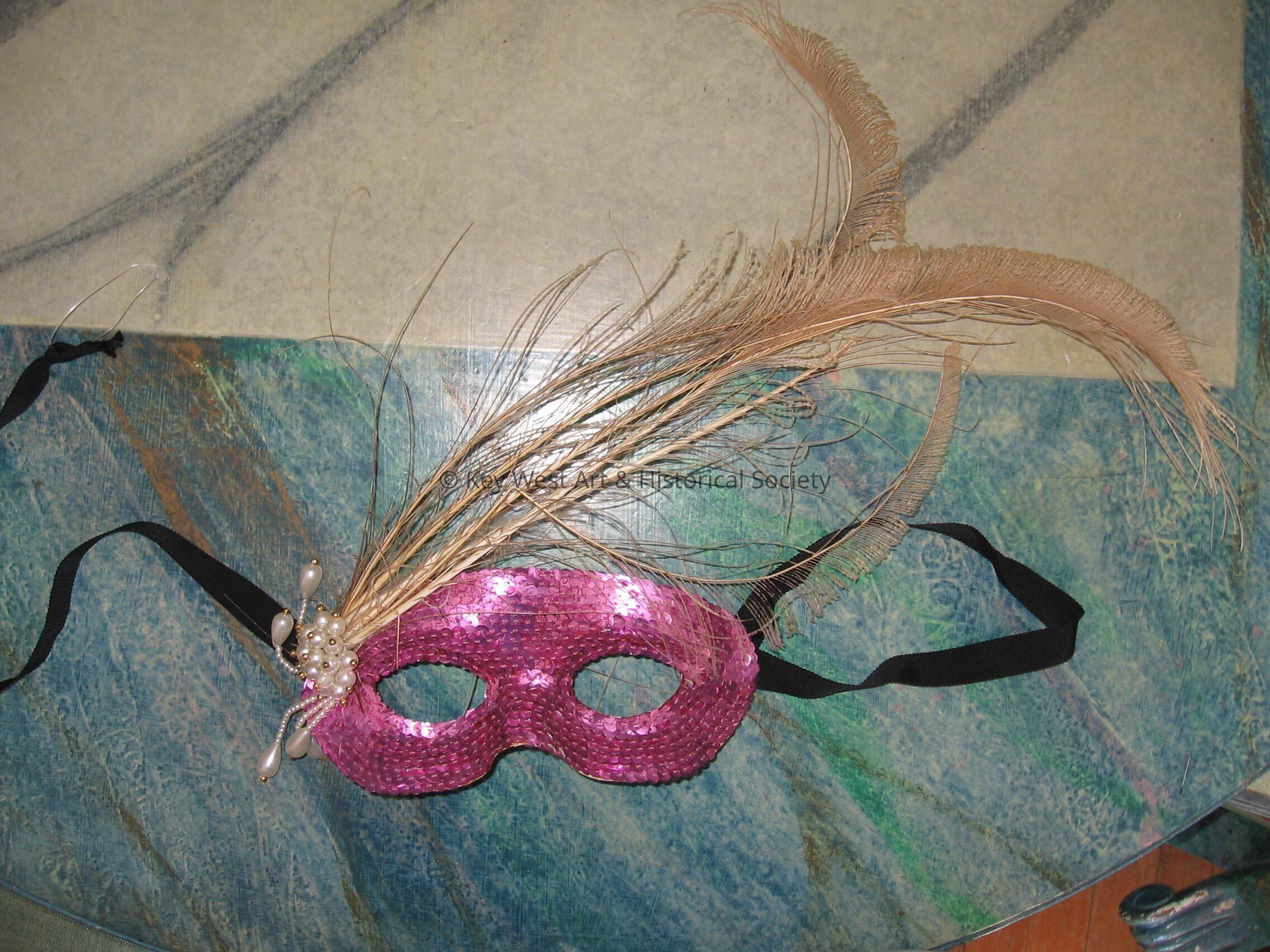 Pink/purple sequin mask. Pearl applique on right side of mask. Feathers on the right side of the mask.Collection