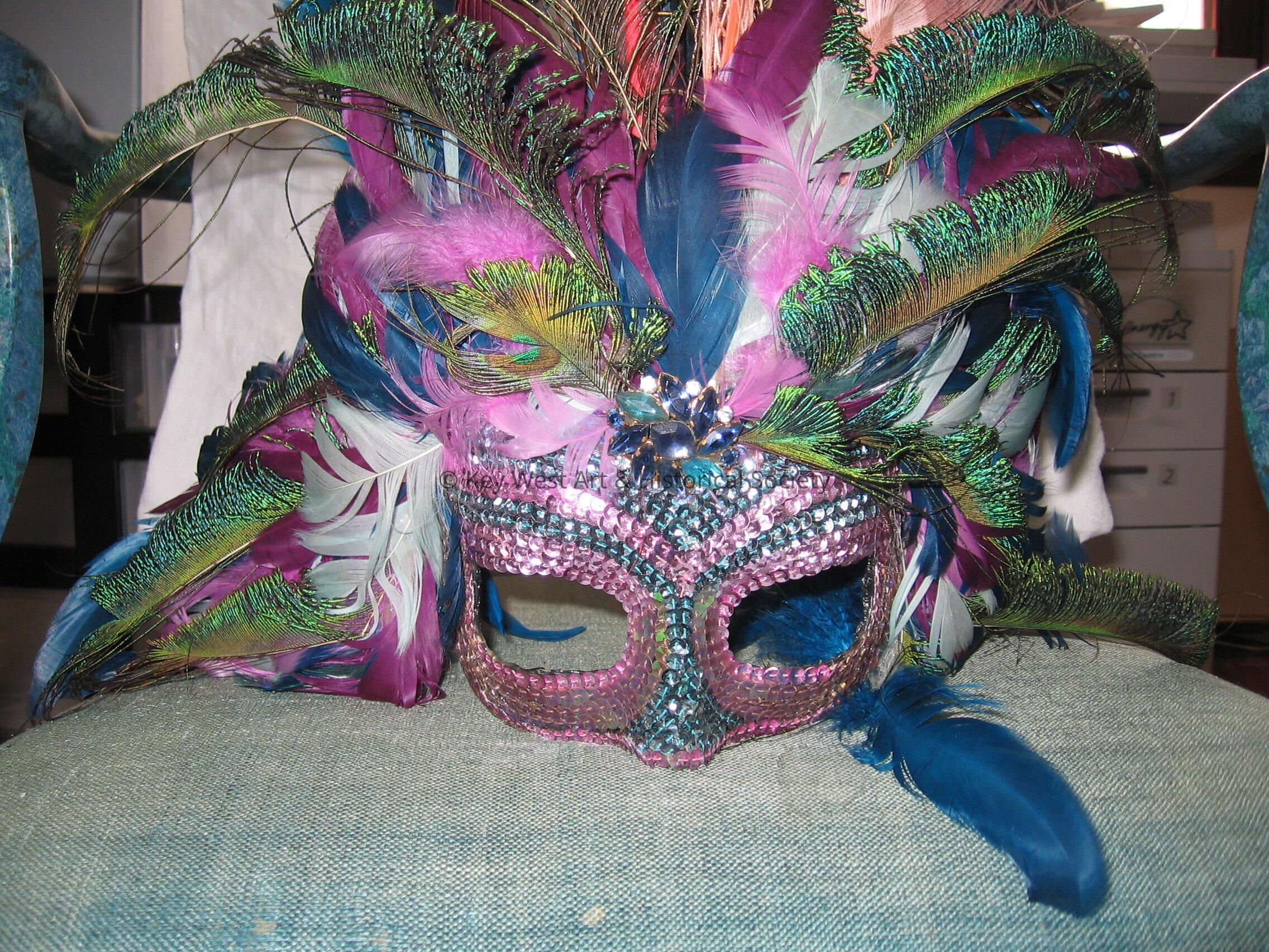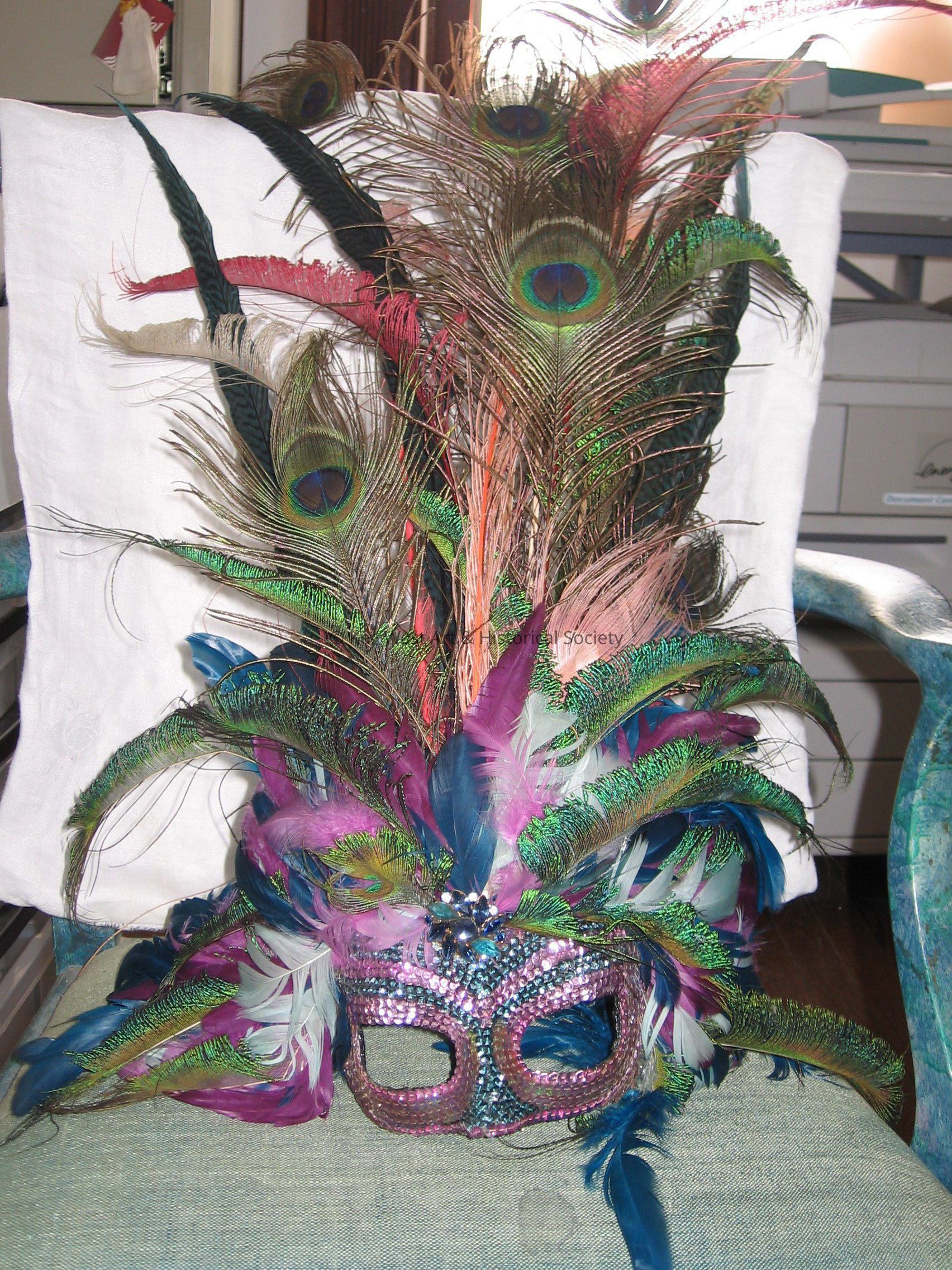Purple and teal sequin masquerade style mask. Purple, teal, and blue peacock feathers on top of mask. Beaded broach on forehead.Collection