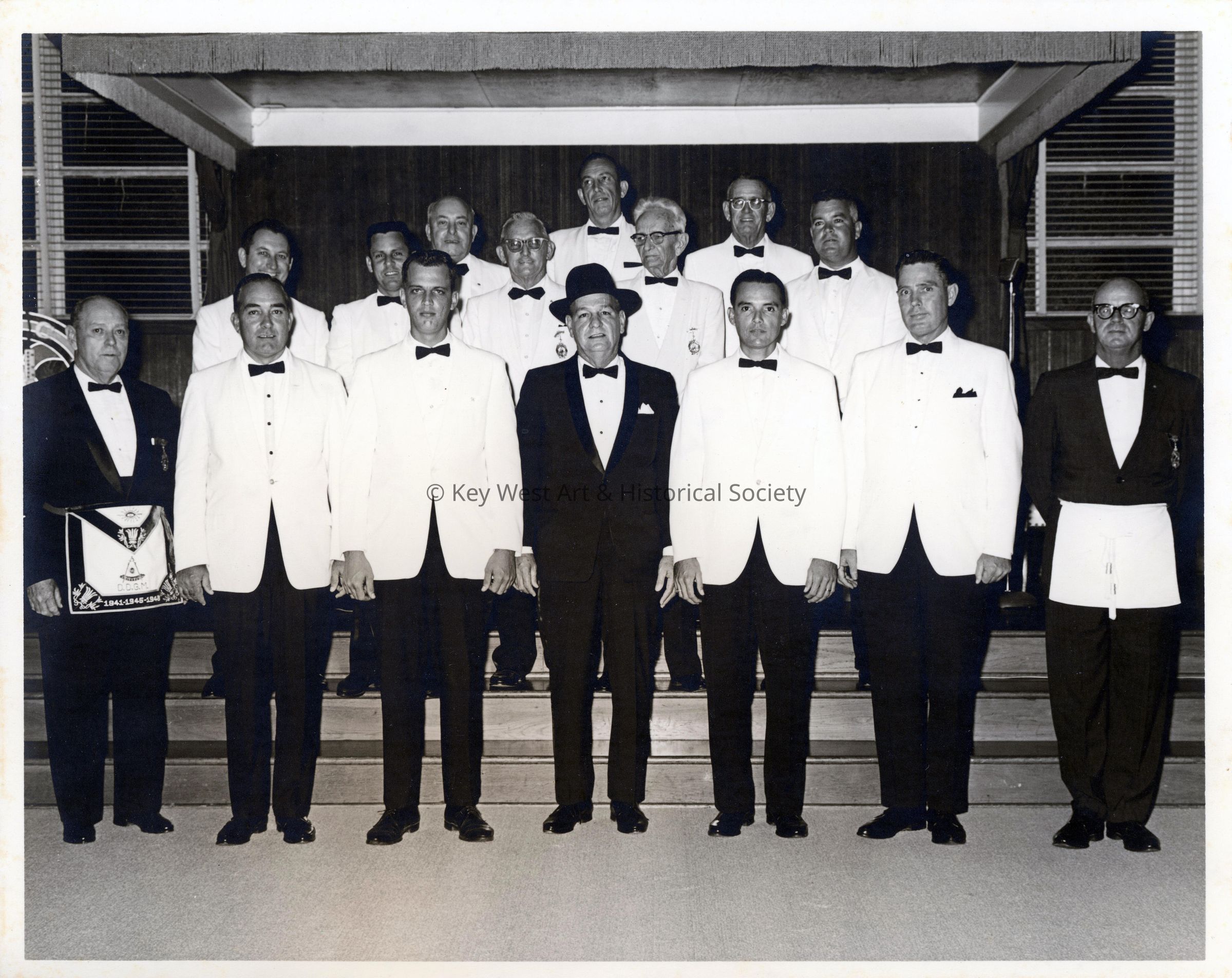 Black and white photograph of the Key West Masonic Chapter Officers at the Masonic Temple at 533 Eaton Street. Front row (l-r) Everett R. Rivas, Terry Easterling, Leonard Knowles, William Alymeda, Paul Gibson, Donald Wiley, Alfred Grunette. Back Row (l-r) Kenneth Williams, Anthony Niles, J Sheppard, Gerald Adams, Gilbert Torres, Jeff Brodhead, Jack Williams, Willie Pendleton.Photograph Details