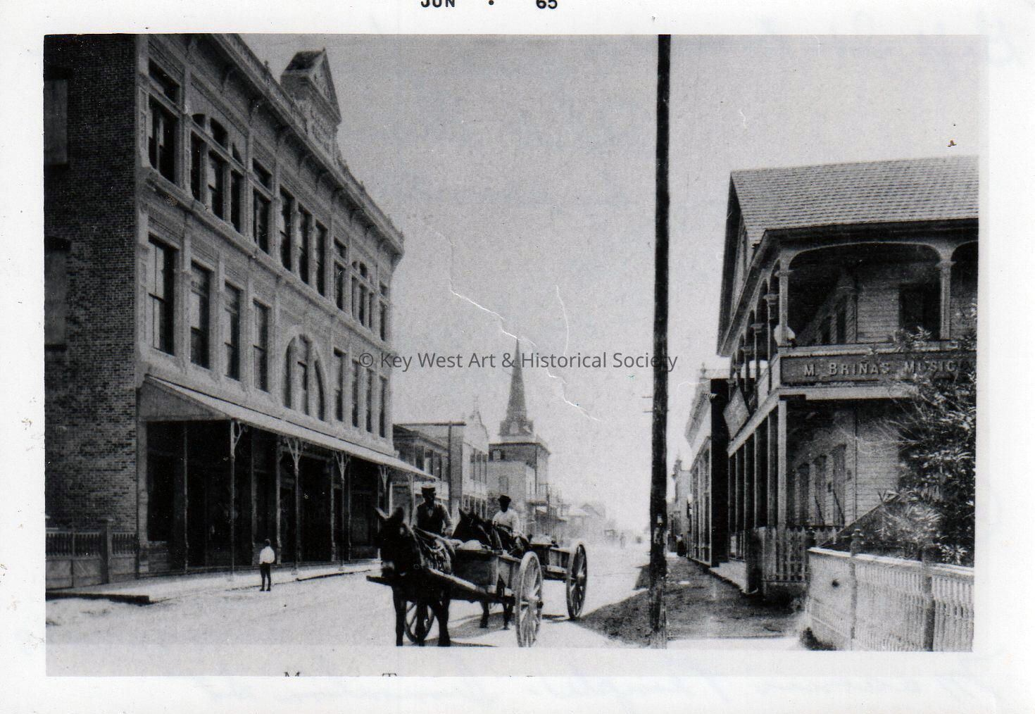 Black and white photograph the Masonic Temple on the left at 315 Simonton Street. Two mule carts are on the street heading toward Eaton Street.