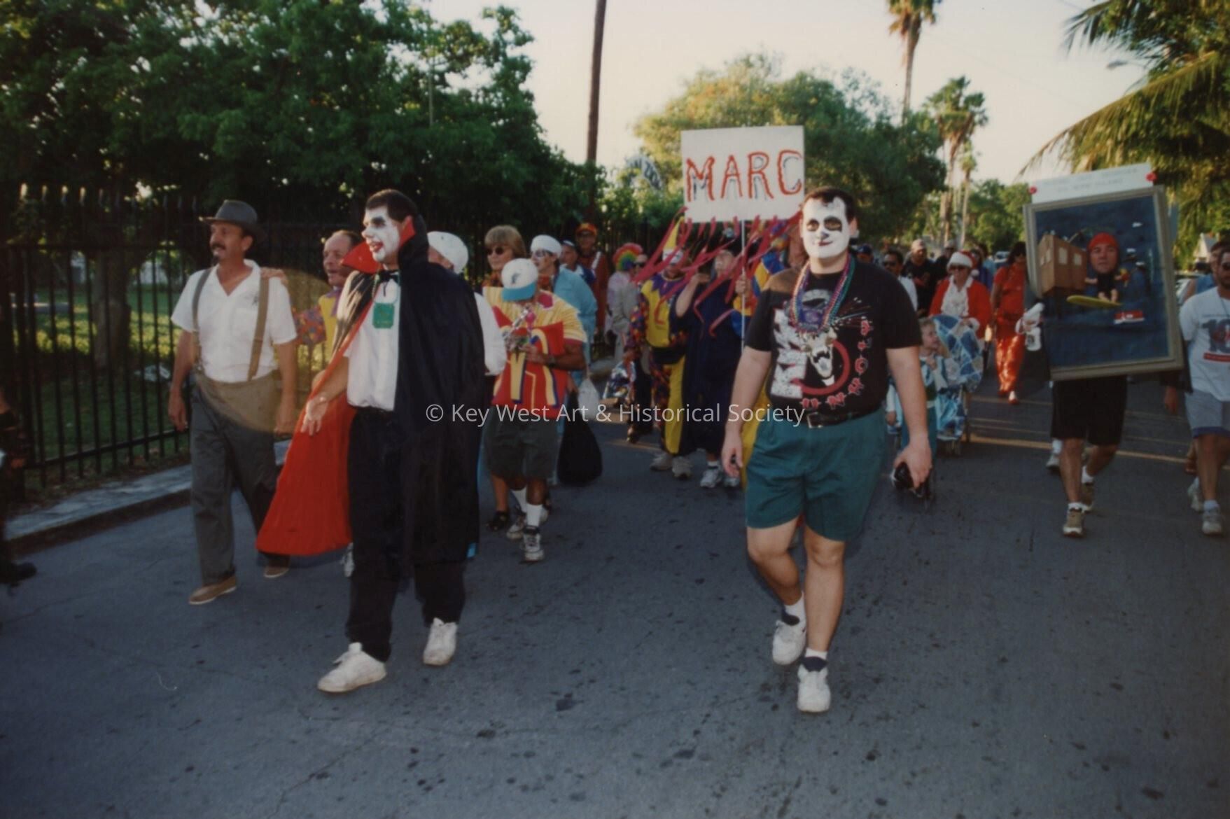 Color photograph of the Masquerade March during Fantasy Fest walking alongside the Key West Cemetery.