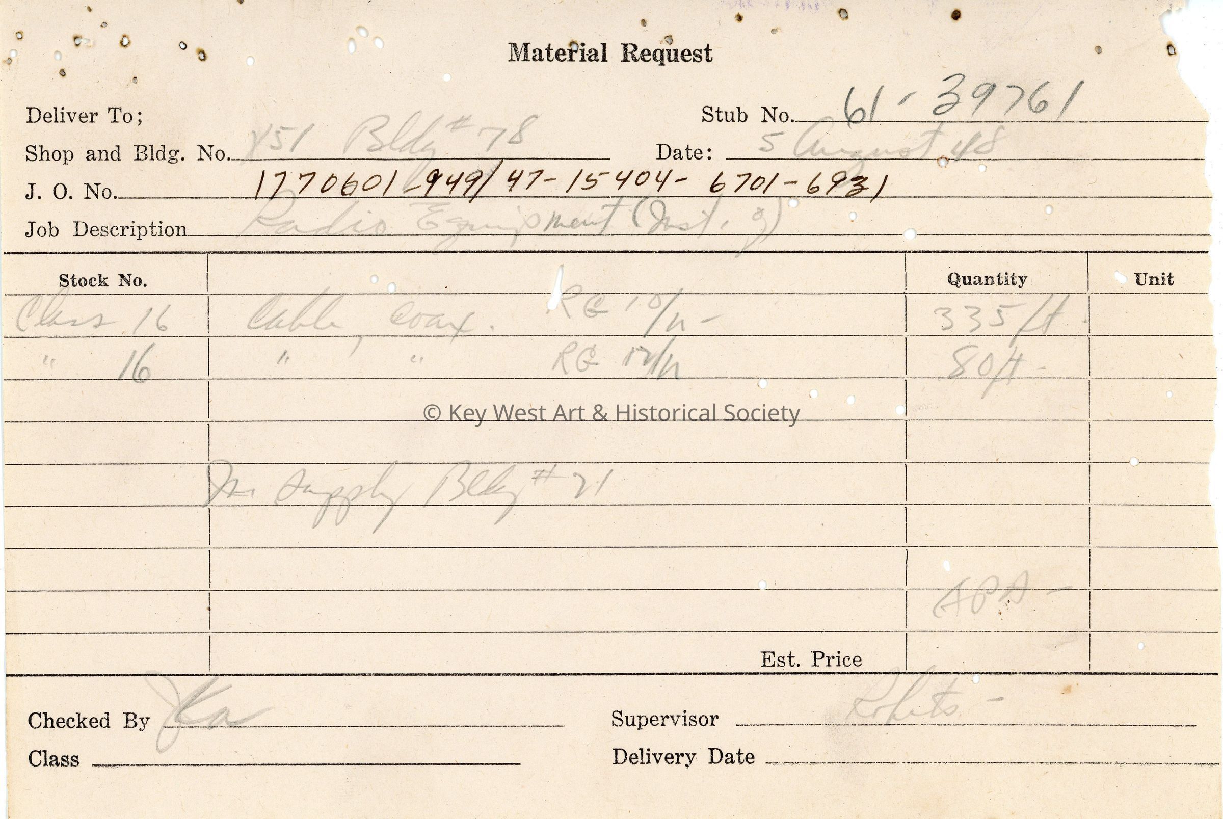 Material request form listing equipment needed for the installation of MAR/RDR radio equipment on the USS EPCS-1431 at Naval Station Key West.