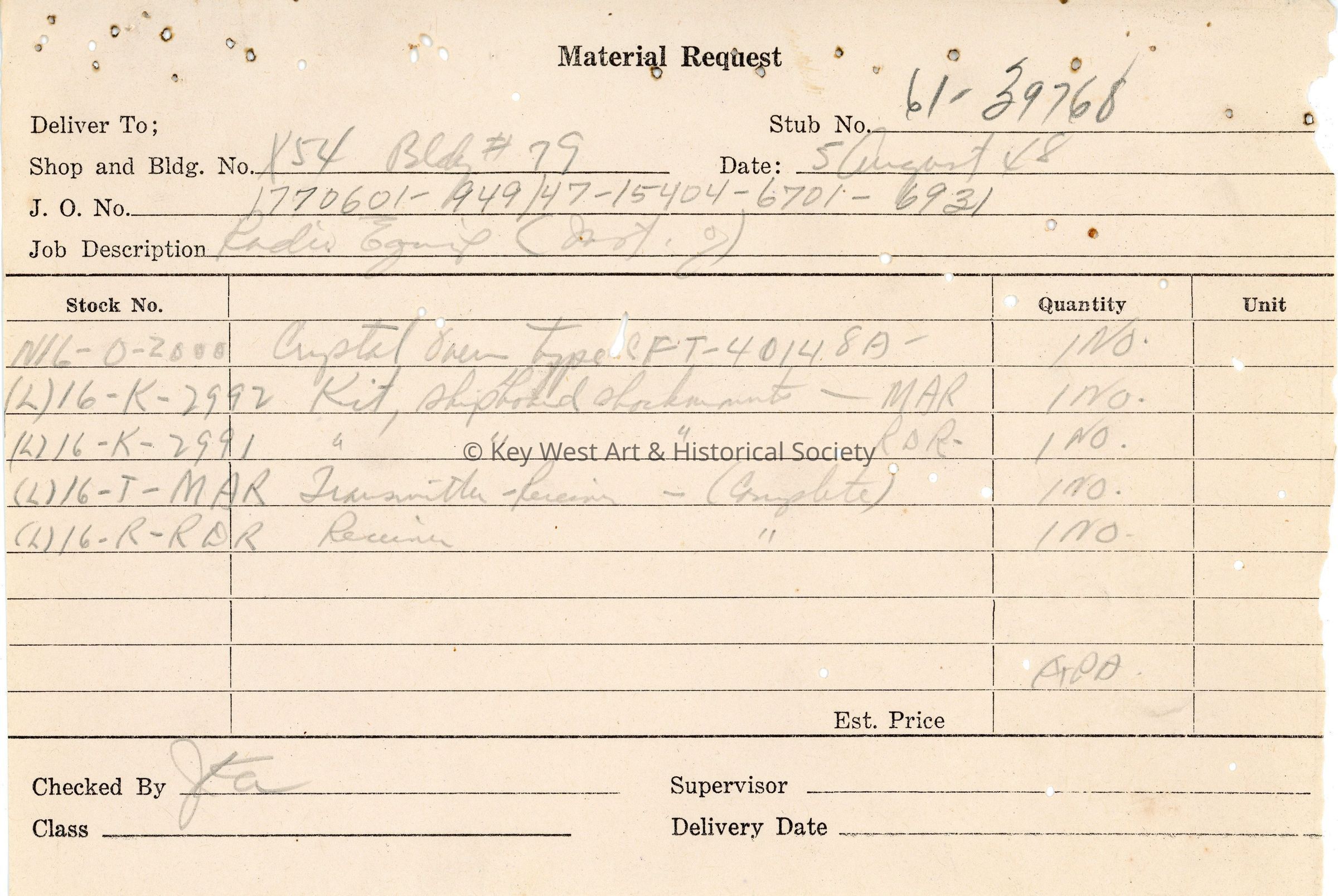 Material request form listing equipment needed for the installation of MAR/RDR radio equipment on the USS EPCS-1431 at Naval Station Key West.