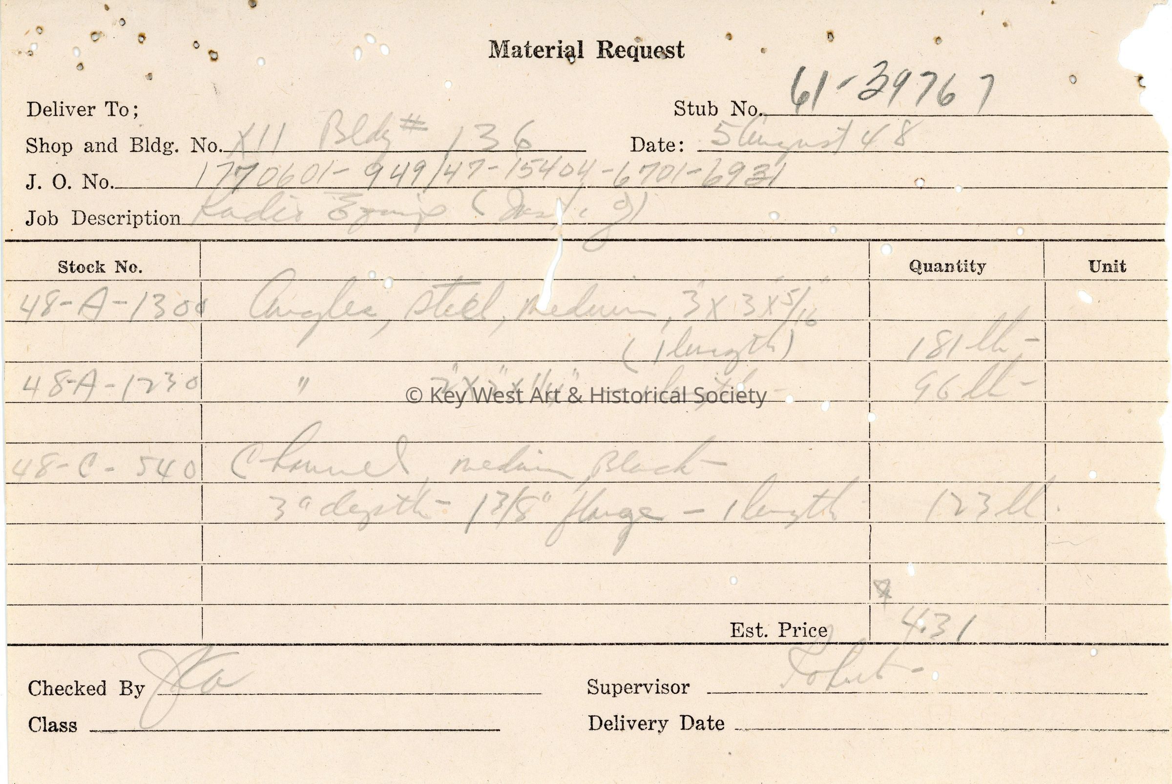 Material request form listing equipment needed for the installation of MAR/RDR radio equipment on the USS EPCS-1431 at Naval Station Key West.