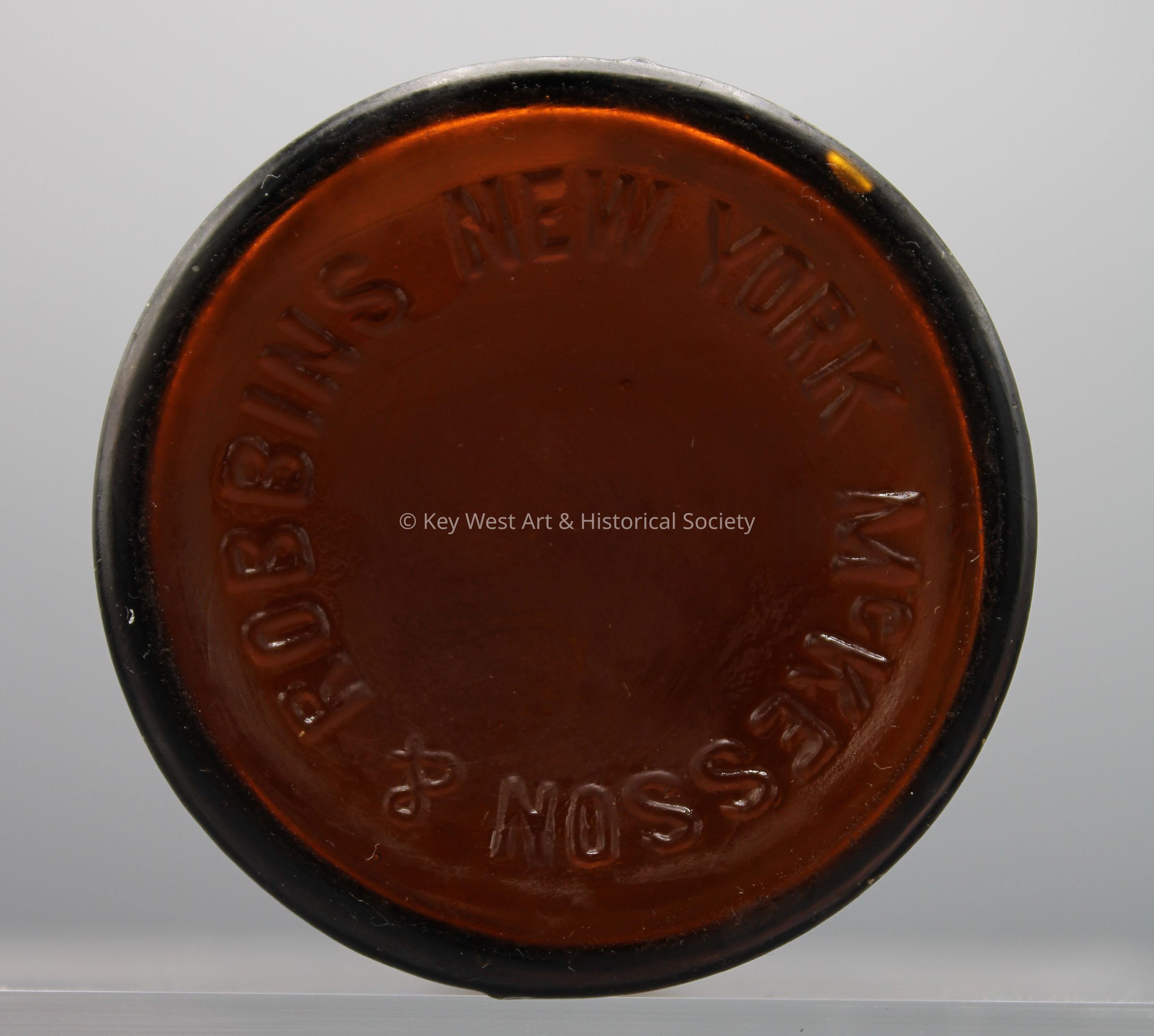 Amber glass bottle with 'McKesson & Robbins New York' embossed on the base. The bottle was originally excavated by the donor's mother, Grace Curlee, during the restoration of Fort Zachary Taylor in the 1960s.