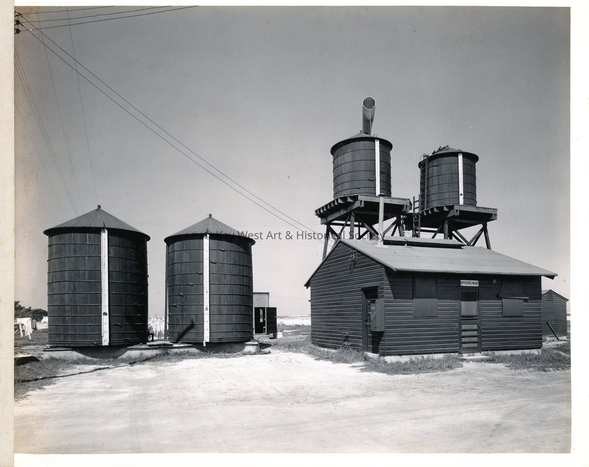 Black and white photograph of Meacham Field water towers on South Roosevelt Boulevard.