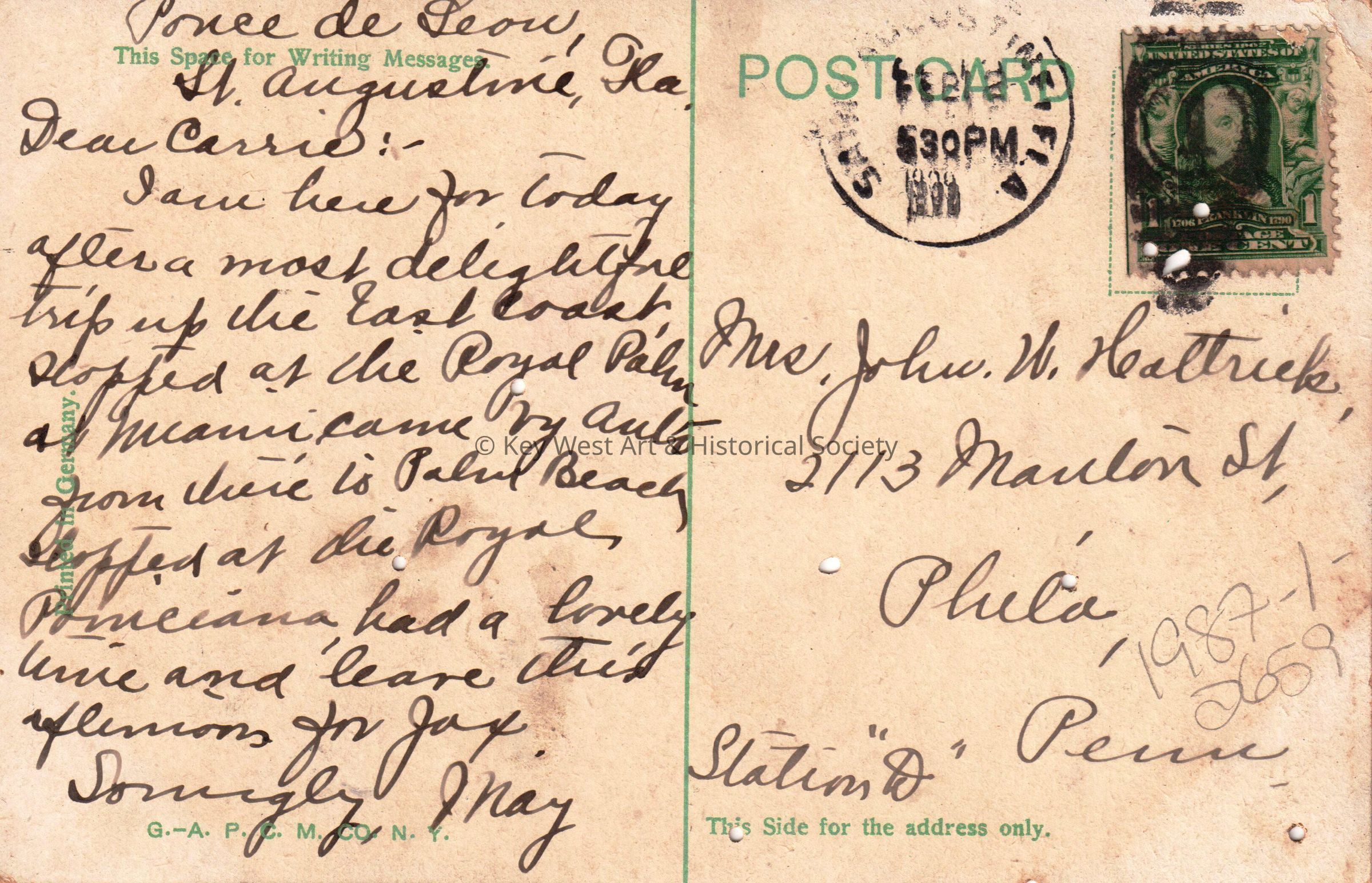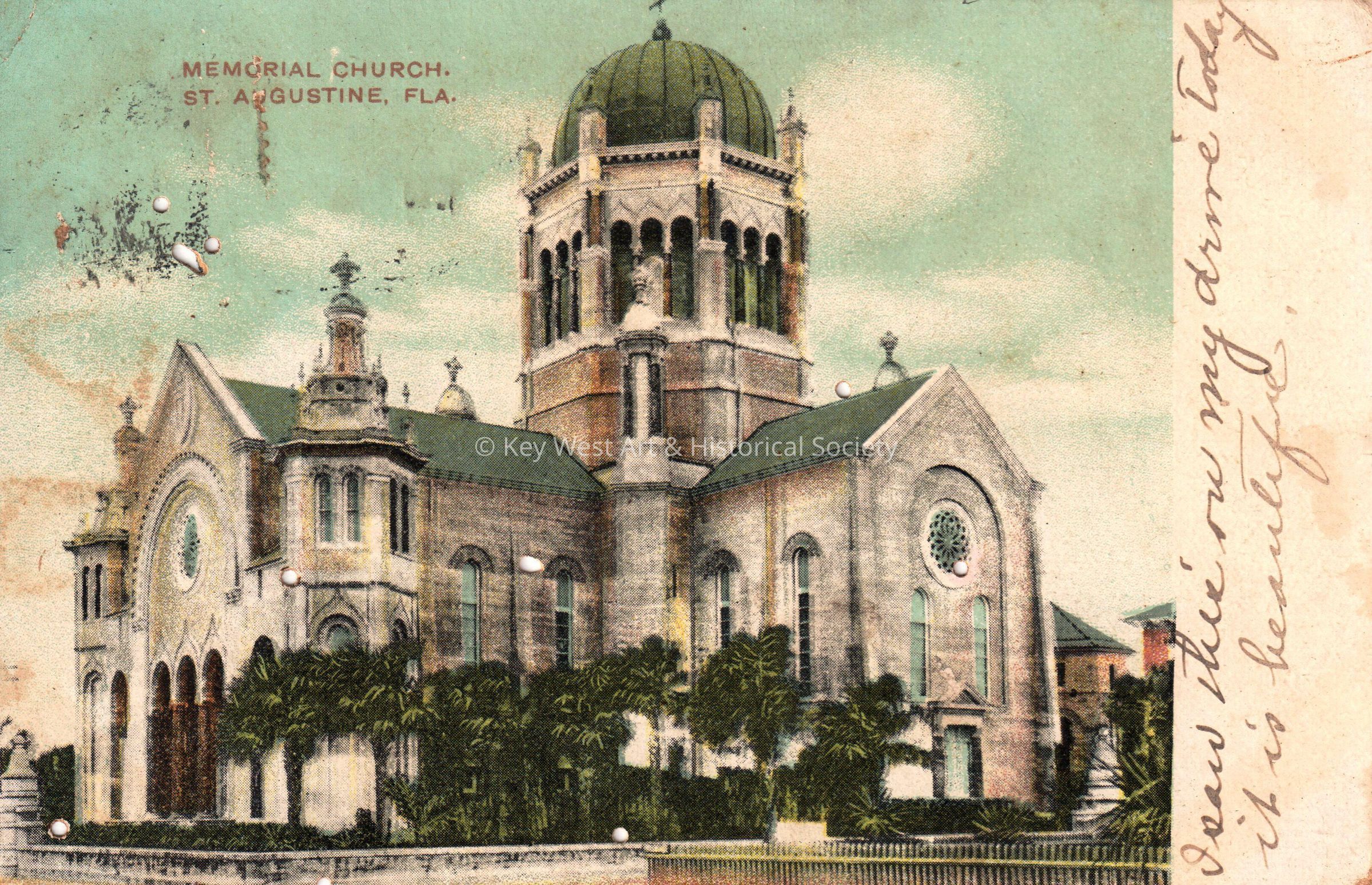 Postcard depicting a large church. The caption reads, ‘Memorial Church, St. Augustine, Florida’. The message on the front reads, ‘I saw this on my drive today. It is beautiful.’ The message on the verso reads, ‘Ponce de Leon, St. Augustine, Florida, Dear Carrie, I am here for today after a most delightful trip up the East Coast. Stopped at the Royal Palm at Miami; came by auto from there to Palm Beach. Stopped at the Royal Poinciana, had a lovely time and leave this afternoon for Jacksonville. Lovingly, May’. The card is addressed to Mrs. John W. Hattrick, 2113 Manton Street, Station D, Philadelphia, Pennsylvania, and is postmarked St. Augustine, February 12, 1909.Collection