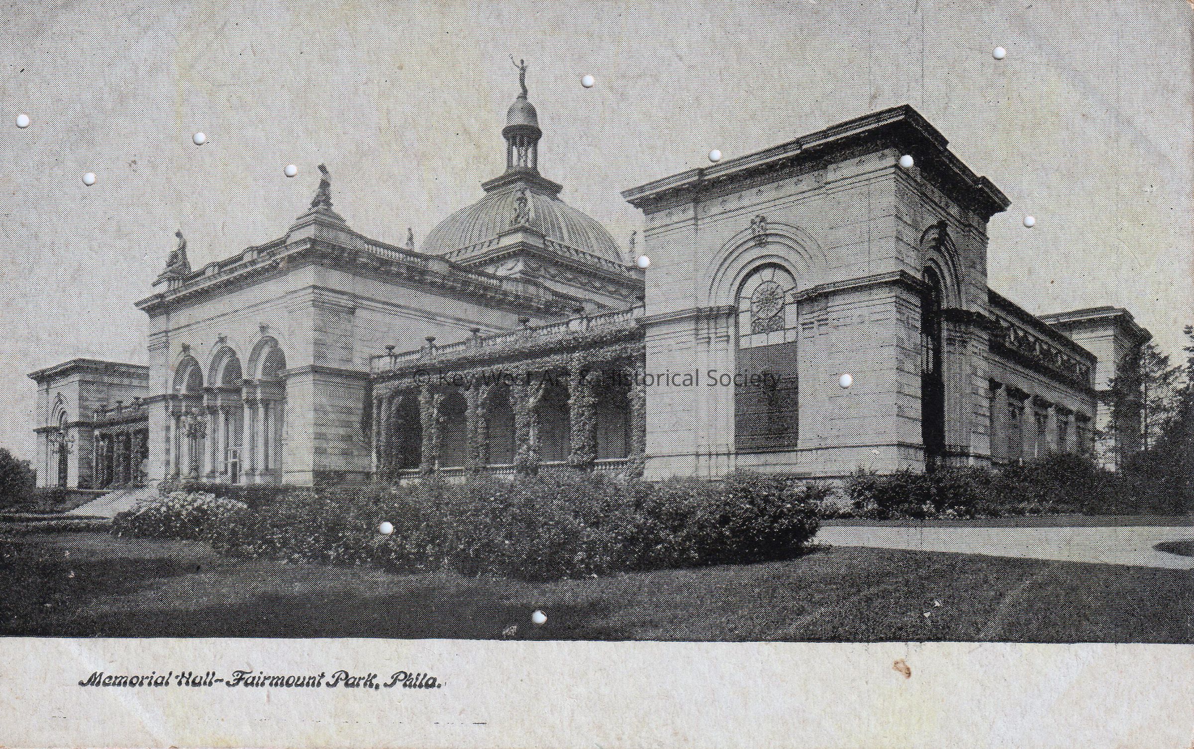 Postcard depicting a large building. The caption reads, ‘Memorial Hall – Fairmount Park, Philadelphia.’Collection