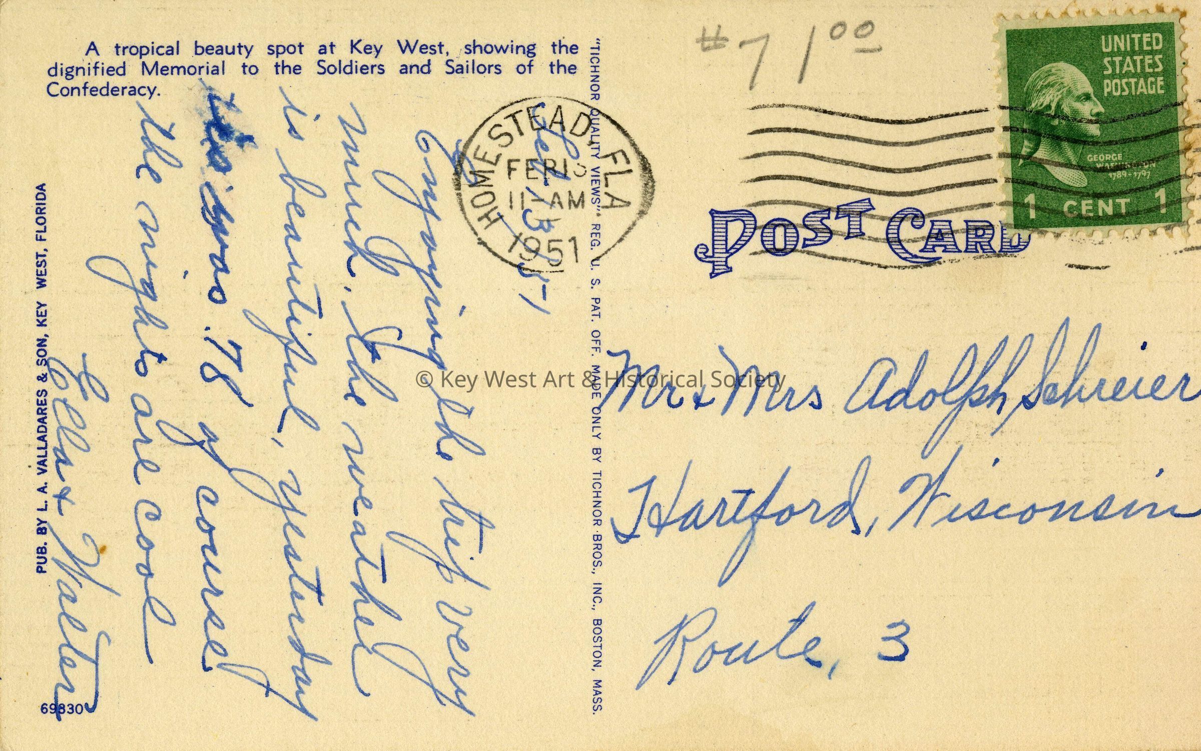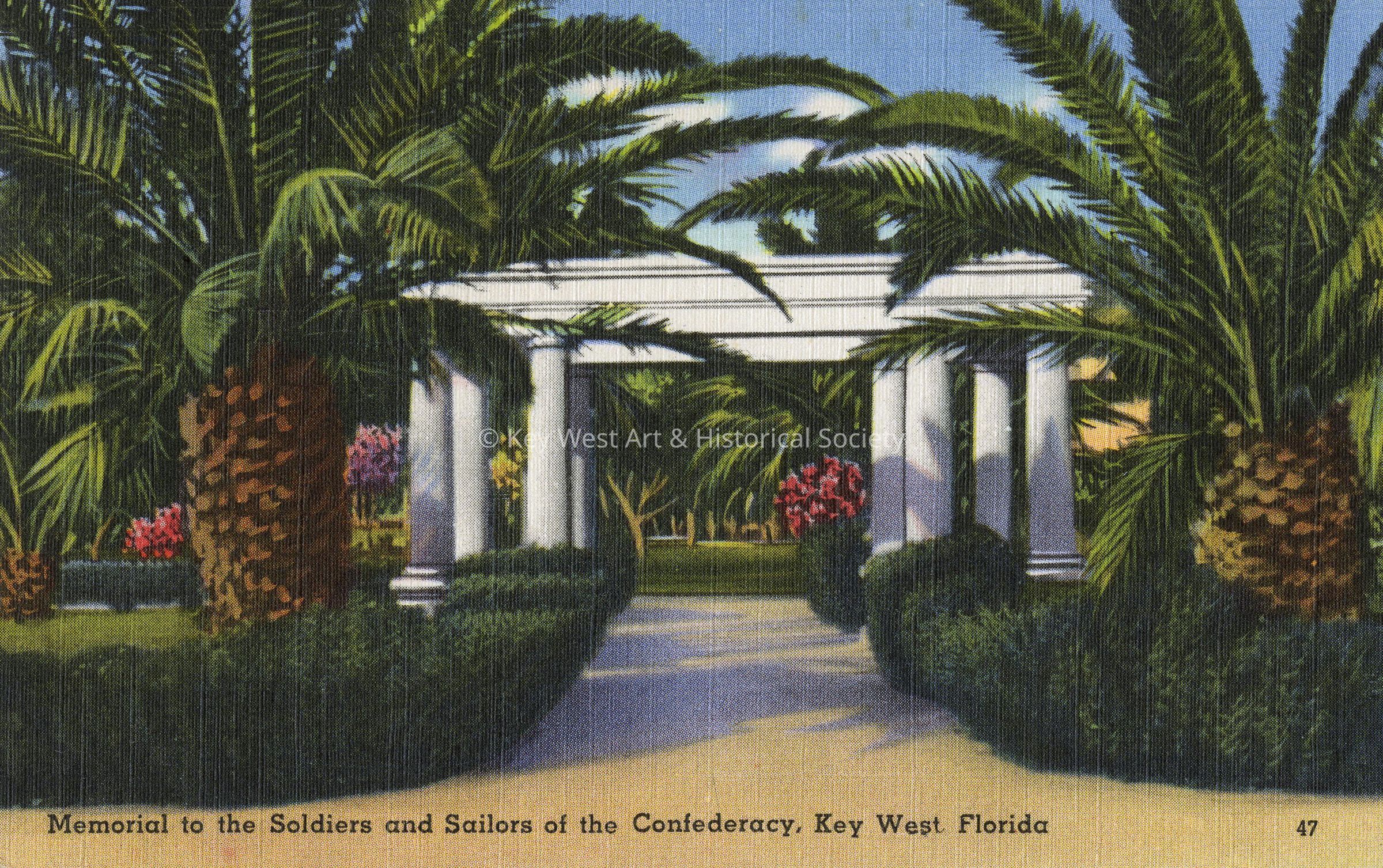 Postcard depicting the Confederate Memorial at Bayview Park. The caption reads, ‘Memorial to the Soldiers and Sailors of the Confederacy. Key West, Florida.‘ The description on verso reads, ‘A tropical beauty spot at Key West showing the dignified Memorial to the Soldiers and Sailors of the Confederacy.’Subject Place