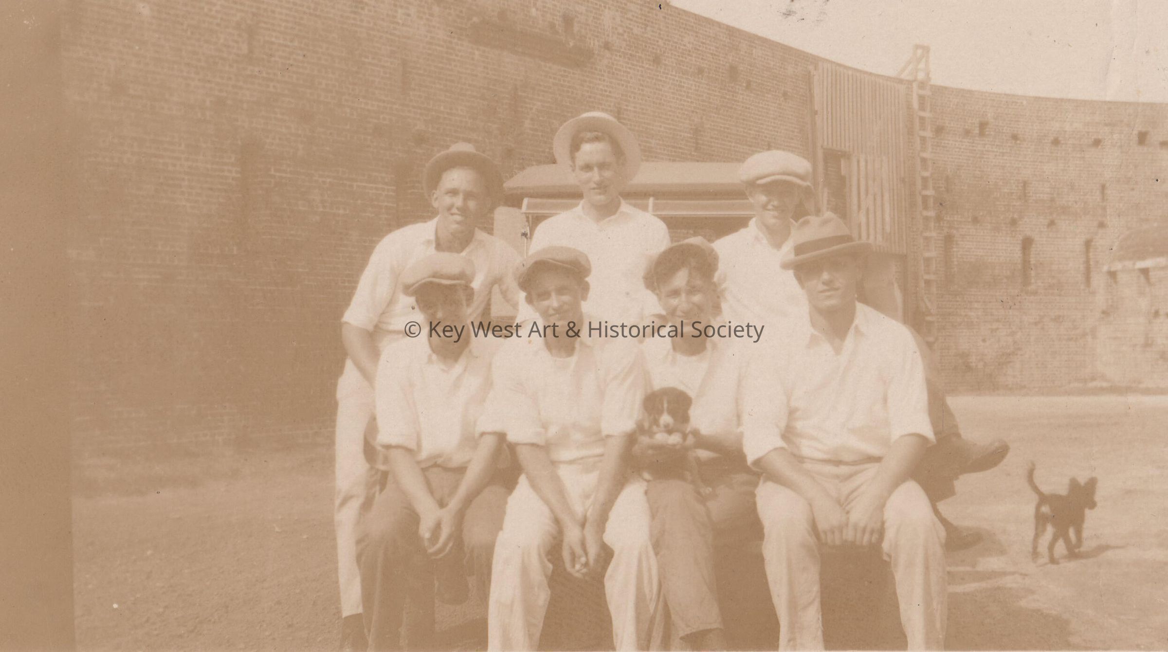 Men and dogs in front of fort - Ousley, Hollingsworth, Whitlock then Bridges, Poole, Kischassly, Wayne - - Navy Radio Men, in 1925.Collection