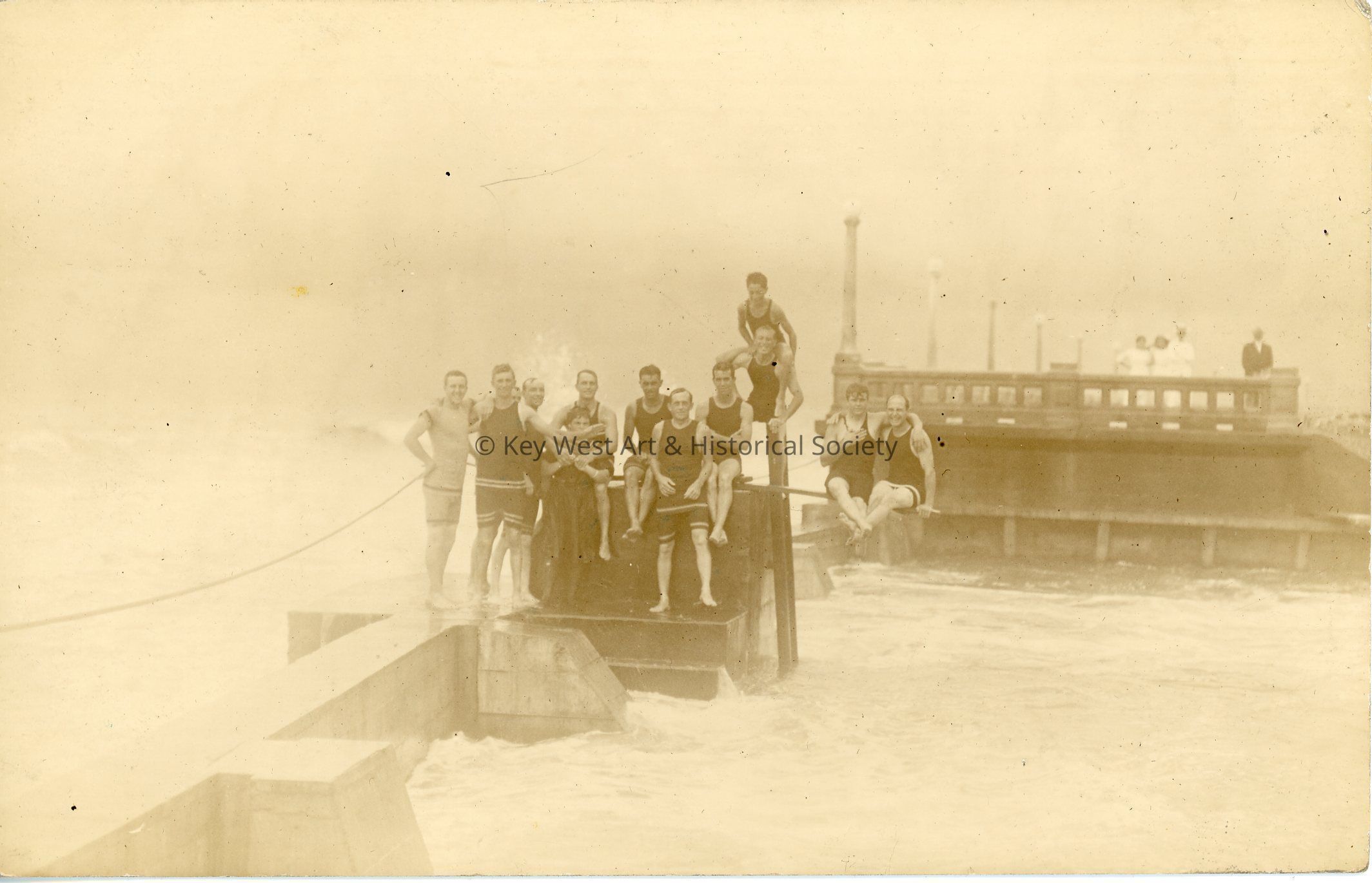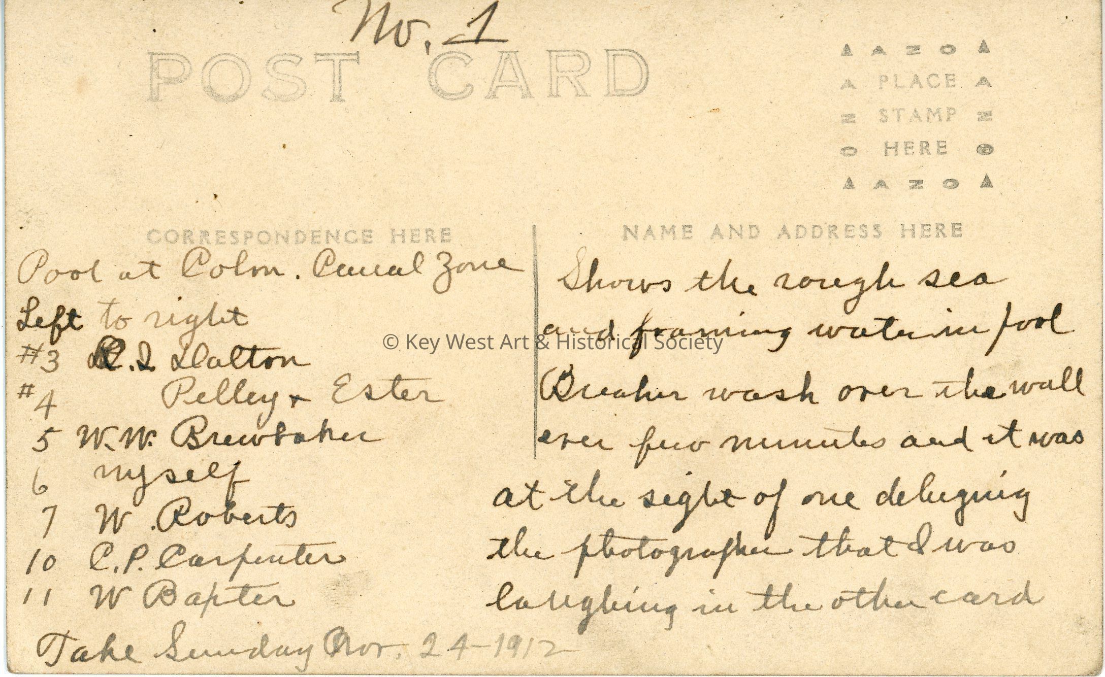 Black and white photograph postcard depicting twelve (12) men and one (1) woman swimming in Colon. The 'pool' is sea water on the other side of a seawall. Third from the left and going to the right are Dalton, Pelley, Ester, W.W. Brewbaker, 'Myself', and W. Roberts. The two on the far right are C.P. Carpenter (L) and W. Baxter (R). Verso has a handwritten note.Subject