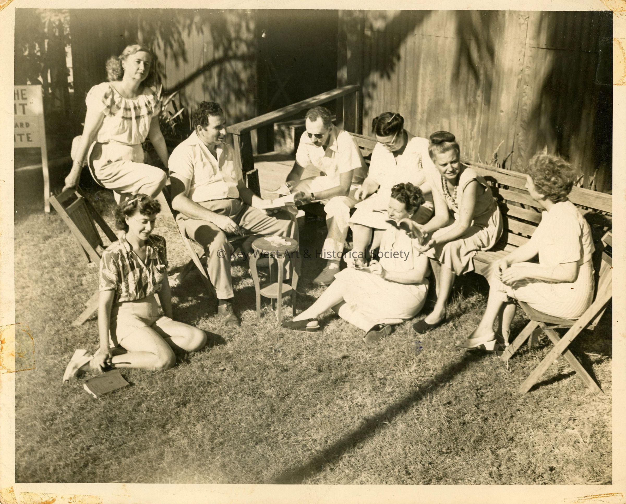 Black and white photograph of a group of men and women gathered outside reading. They are identified as Wanda Lazarana, Joe Lazarana, Commander Lee Goddard, Dorothy Raymer and Emily Goddard.Photograph Details