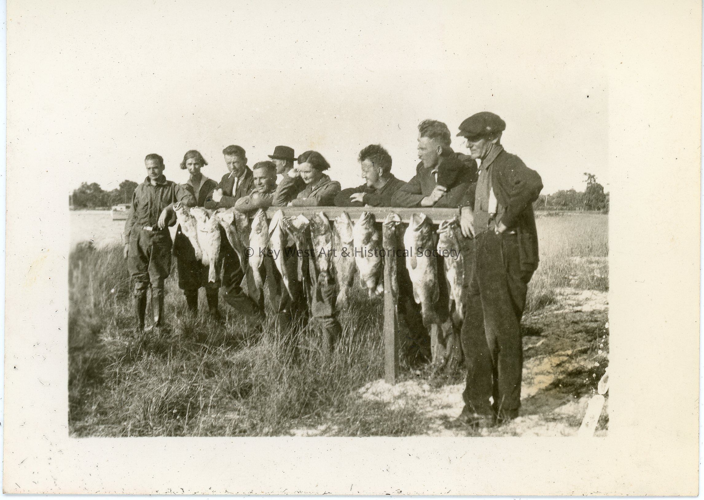 Black and white photograph of eight (8) men and two (2) women standing behind a wooden beam that has many fish hanging from it. The photo was part of a photograph album began by Victor H. Baker in 1940.