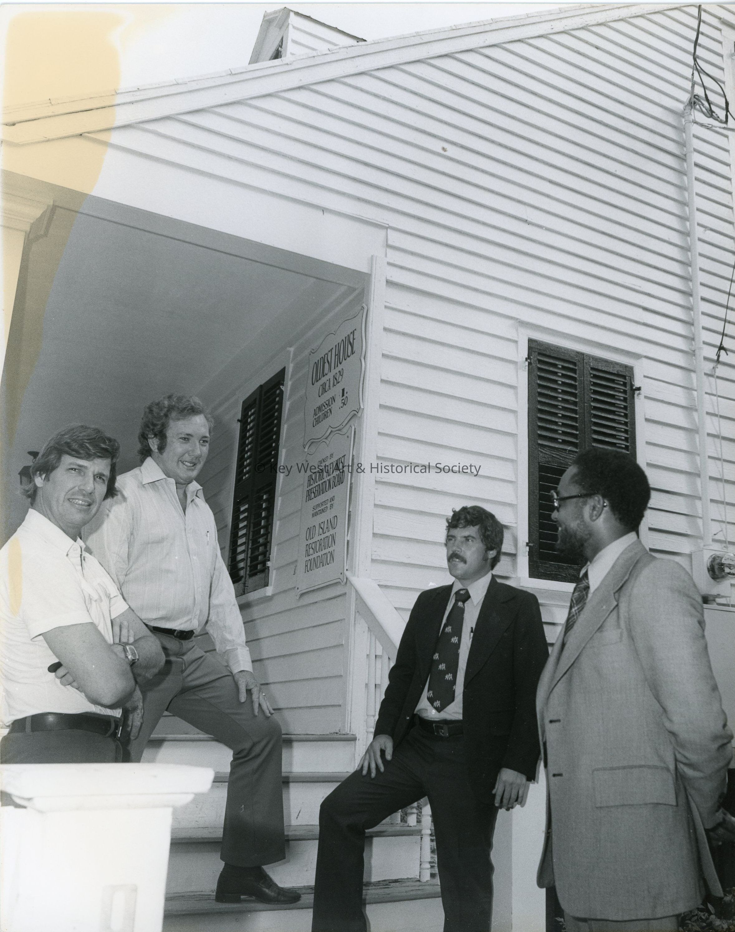 Black and white photograph of James Mastin (left) and Alton Lowe with two unknown men standing on the steps of the Oldest House at 322 Duval Street.