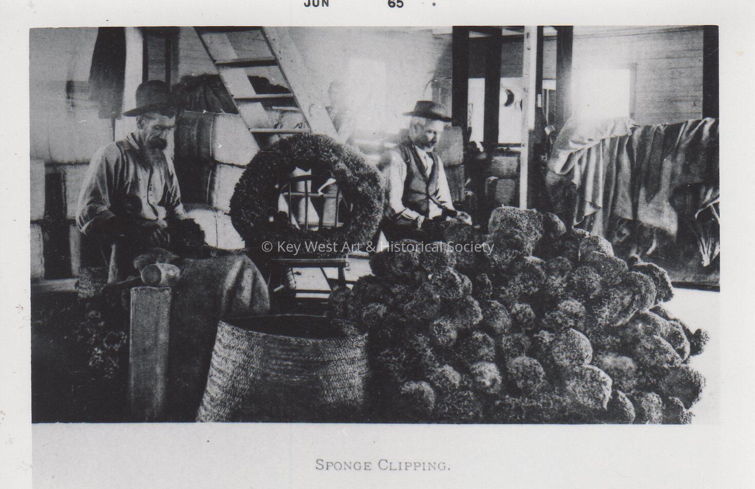 Black and white photograph of two men in a sponge warehouse sheering sponges.