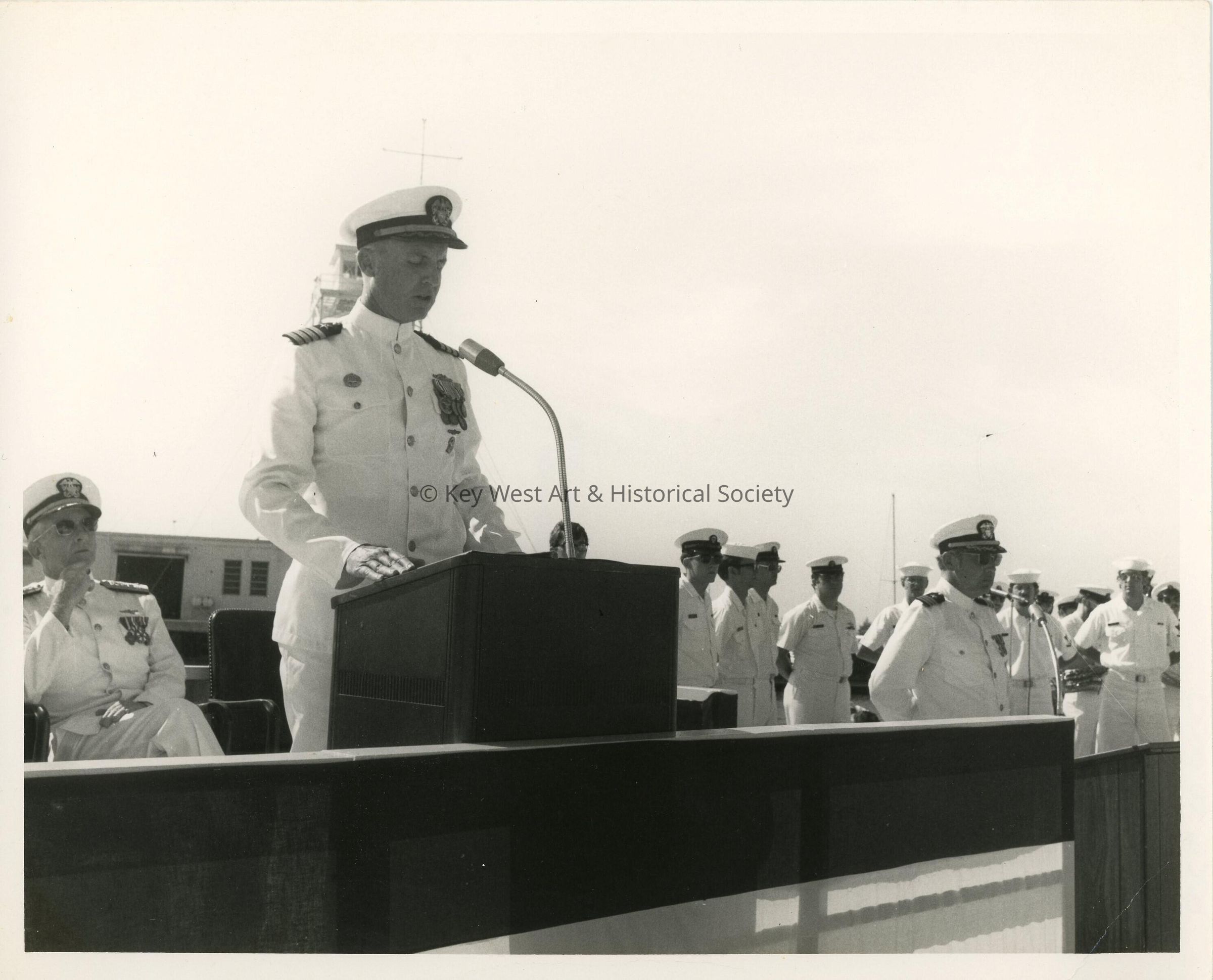 Men in uniform at a ceremony, one standing at the podium.Collection
