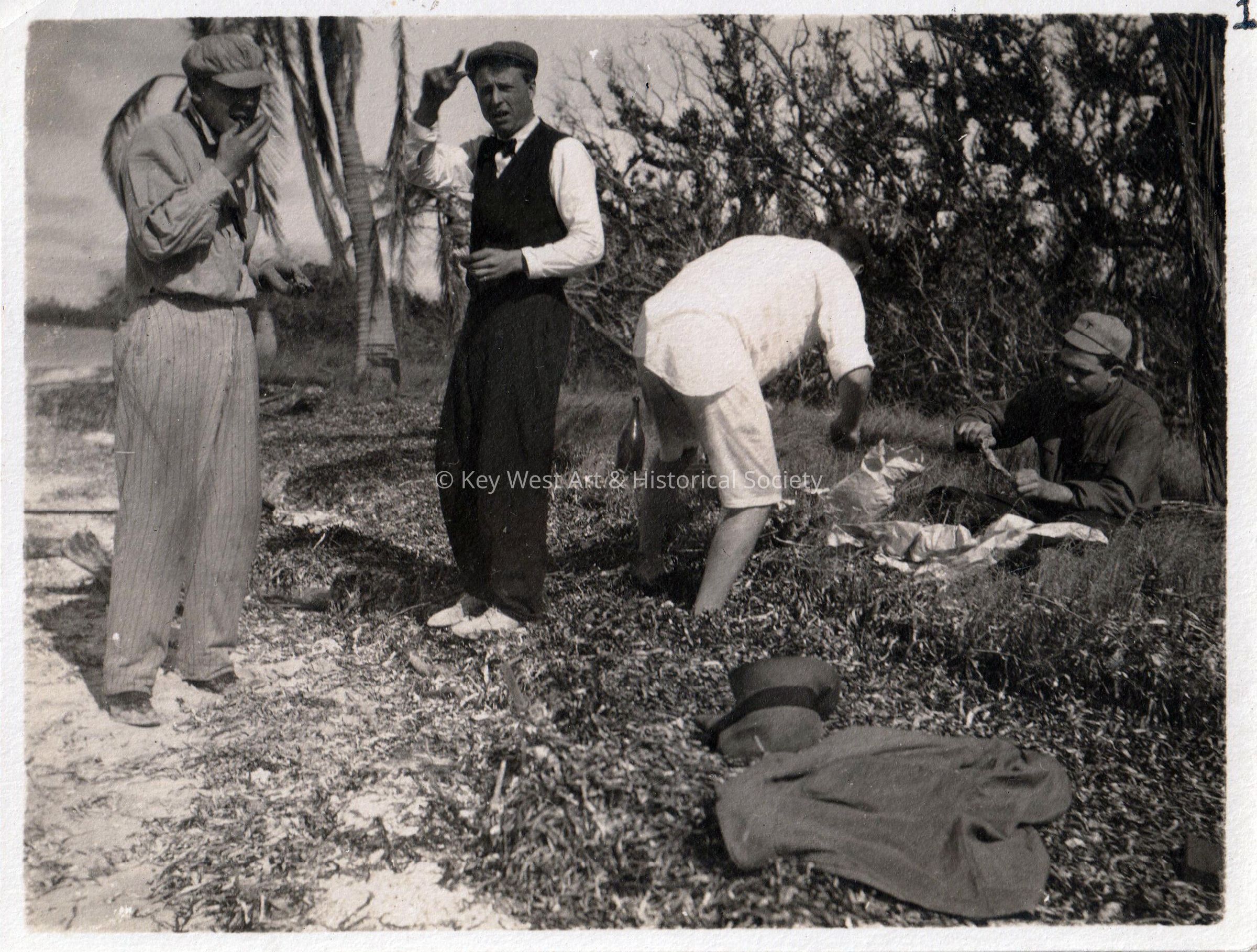 Black and white photograph of four unknown men having a picnic on Loggerhead Key.