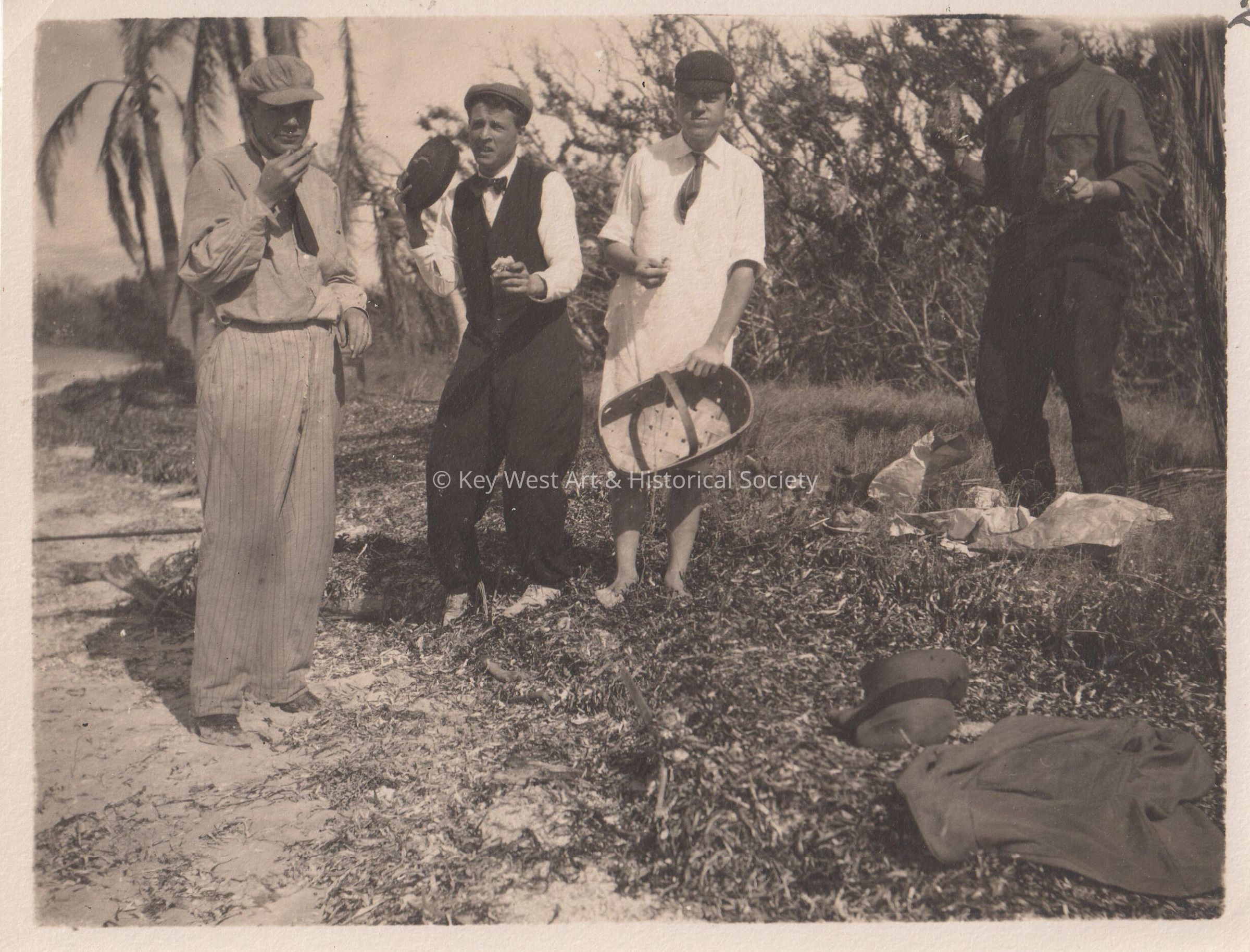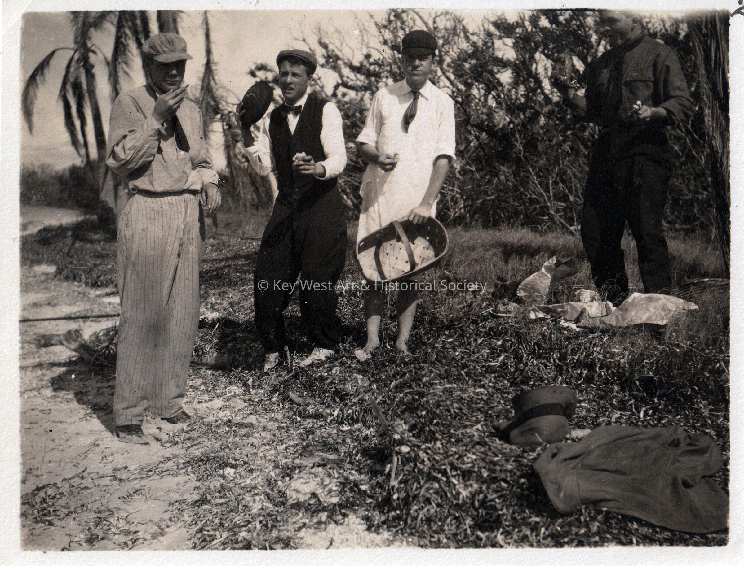 Black and white photograph of four unknown men having a picnic on Loggerhead Key.Collection