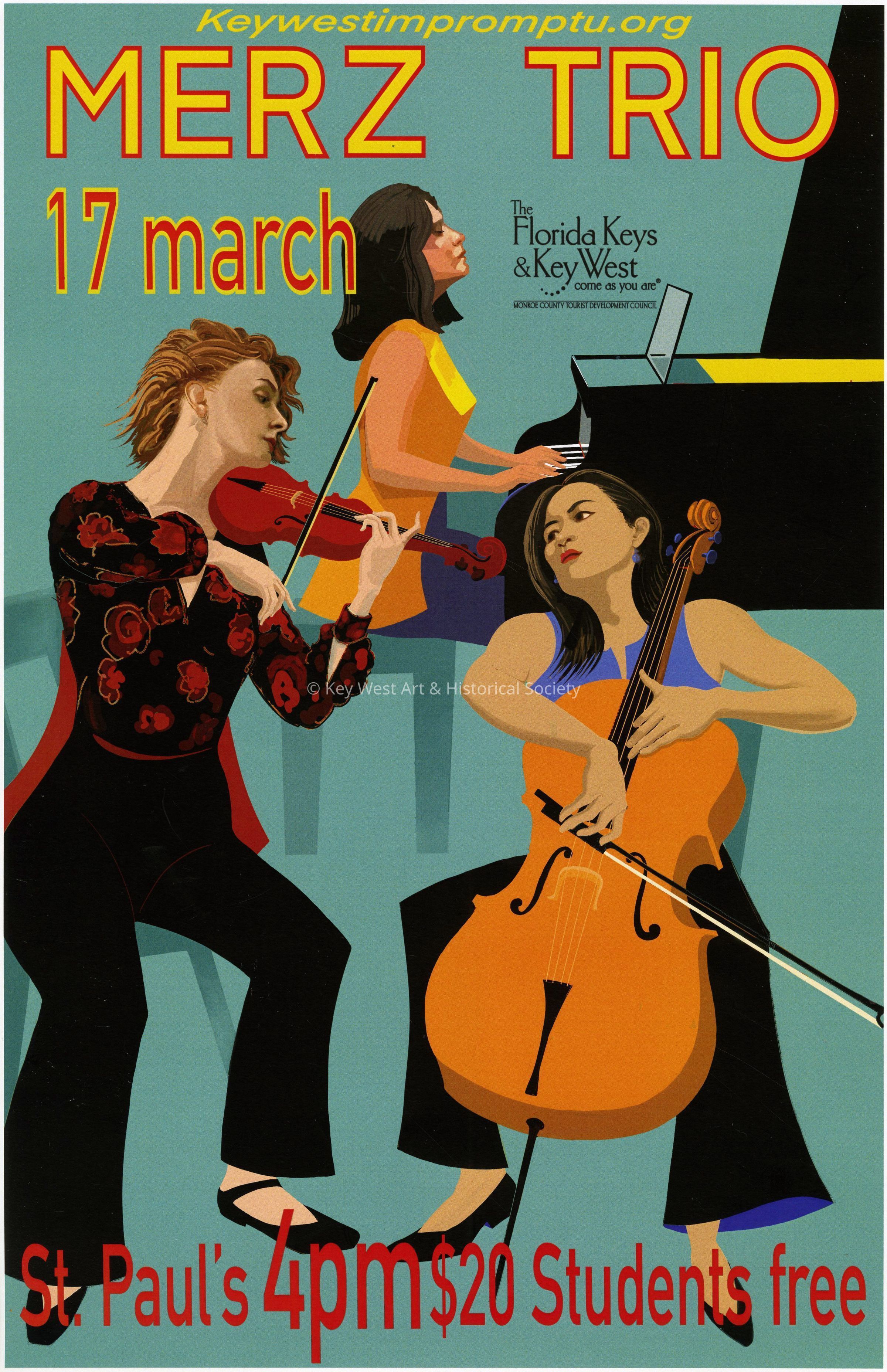 An advertising poster for Impromptu Classical Concerts entitled 'Merz Trio'. The concert took place on March 17, 2024 at St. Paul's Episcopal Church at 401 Duval Street.Collection