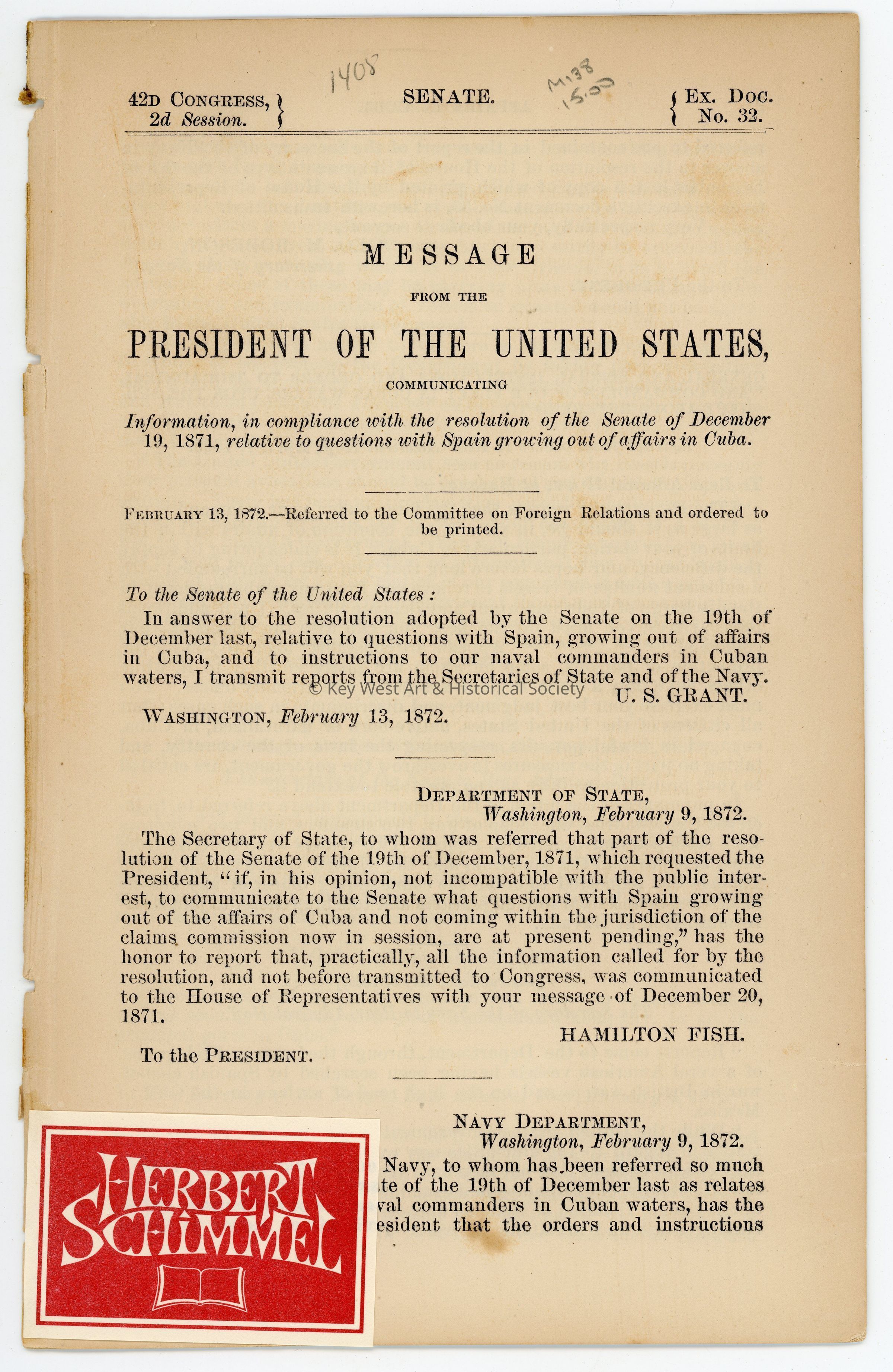 Excerpt from the recordings of the second session of the 42nd Congress including reports to President Ulysses S. Grant from the Secretaries of State and of the Navy concerning Spanish activity in Cuba between 1869 and 1872. A small book plate from the owner has been attached to the lower left corner.Collection