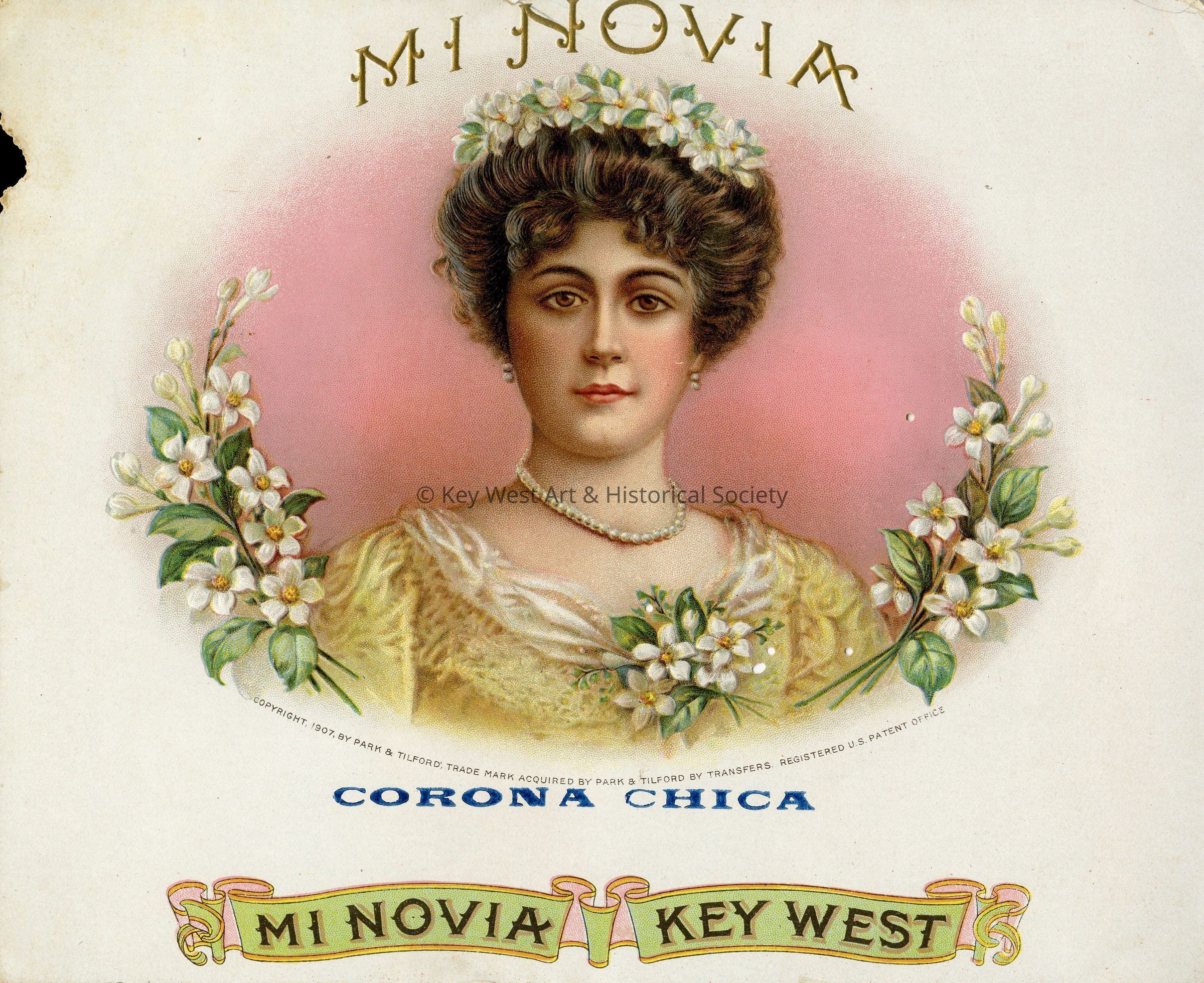 Full color lithograph inner cigar box label promoting Mi Novia Key West manufactured by Park & Tilford. Likely taken from a sample book produced by the lithographer.Type of Print